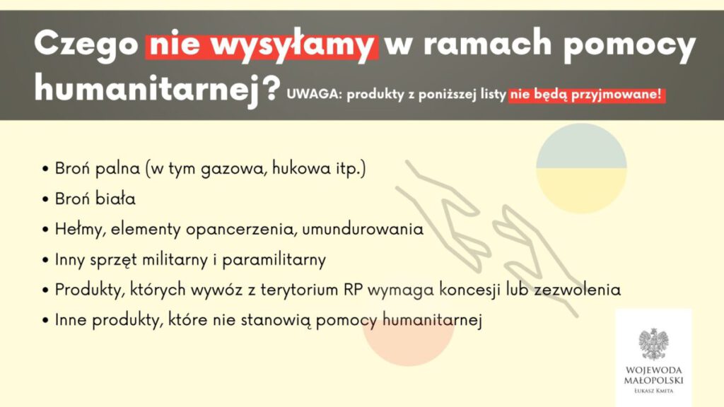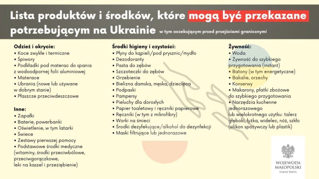 Wojewoda małopolskiego Łukasza Kmita zaprasza wszystkich starostów i prezydentów miast na prawach powiatu do współtworzenia Wojewódzkiego Systemu Koordynacji Pomocy dla Ukrainy i zorganizowania w każdym powiecie powiatowych magazynów pomoc (PMP). Prosimy, aby lokalnie właśnie tam przewożone były dary dla Ukrainy – zarówno te gromadzone na poziomie gmin, jak i te zbierane przez organizacje czy po prostu zbiórki indywidualne.