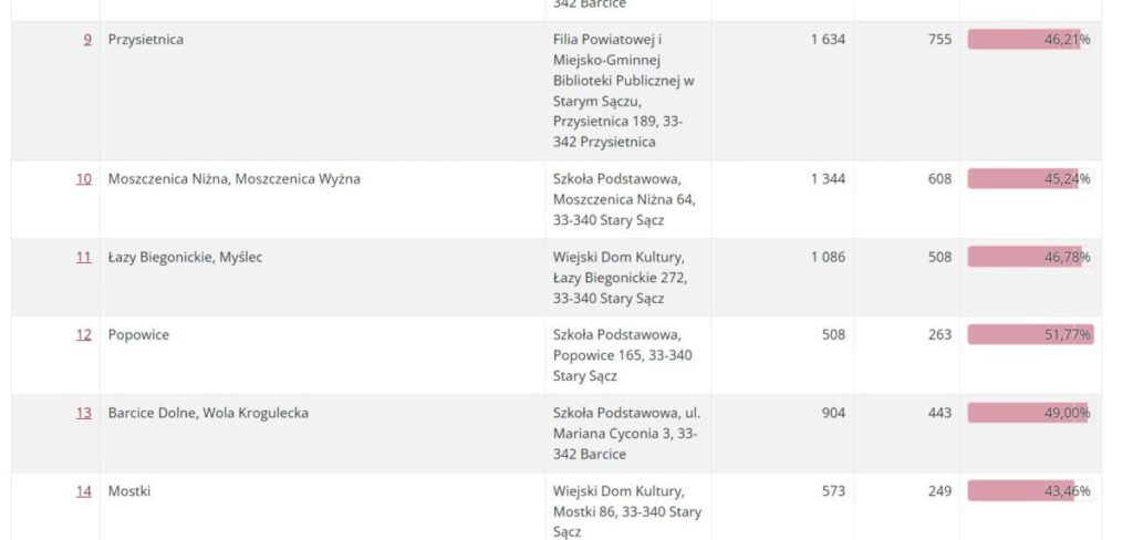 Dla porównania w Nowym Sączu do urn poszło: 20,51% mieszkańców. Najwyższą frekwencję odnotowano w Korzennej: 27,77%, najniższą w Muszynie: 17,58%