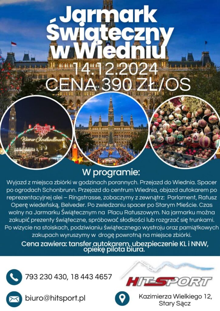 Marzysz o magicznej świątecznej atmosferze wypełnionej zapachem grzanego wina i świeżych pierników? Biuro Turystyczne Hit-Sport&Travelisland ze Starego Sącza zaprasza do udziału w wycieczce do Wiednia na Jarmark Świąteczny.