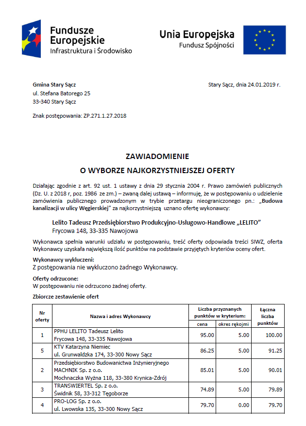 Nowy odcinek kanalizacji sanitarnej dla terenów przy ul. Węgierskiej (od tzw. „pasów leśnych” w kierunku Barcic) będzie miał 1,5 kilometra.Ten odcinek kanalizacji wybuduje Przedsiębiorstwo Produkcyjno-Handlowo-Usługowe „Lelito” z Nawojowej. Cena za jaką firma zrealizuje inwestycję to nieco ponad 770 tys. zł.