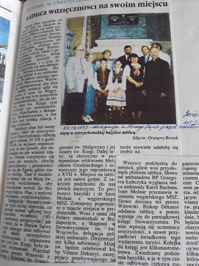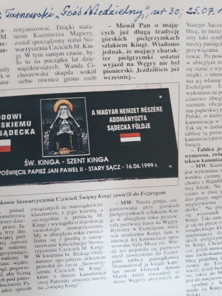 Dzisiaj o godz.7.00 rano z Rynku w Starym Sączu wyruszyła grupa blisko 115 pielgrzymów do Ostrzyhom (węg. Esztergom) czyli miejsca urodzenia świętej Kingi. Tam odbędą się uroczystości związane z 20 rocznicą Kanonizacji św Kingi i 20 rocznicą odsłonięcia tablicy podarowanej do Bazyliki jako dar wdzięczności za Św. Kingę
