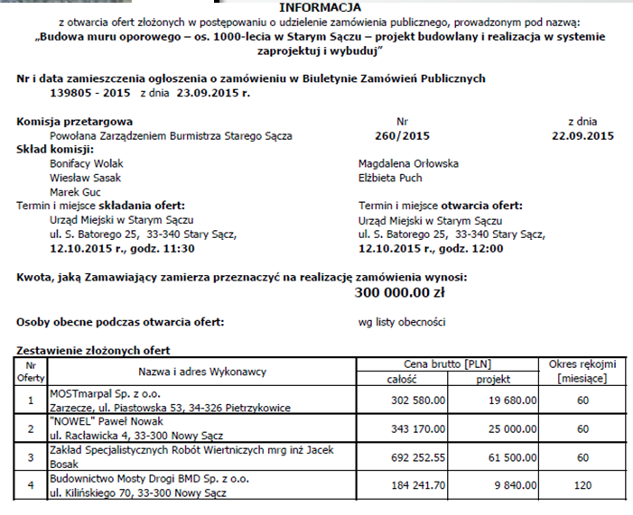 Firma BMD z Nowego Sącza podjęła się wykonania i zabezpieczenia muru oporowego na Osiedlu 1000-lecia w Starym Sączu. Gmina ogłosiła przetarg i wpłynęły 4 oferty. Jednak najkorzystniejszą z nich przestawiło właśnie Budownictwo Mosty Drogi z Nowego Sącza. Zadanie wyceniono na 184 241,70 zł.