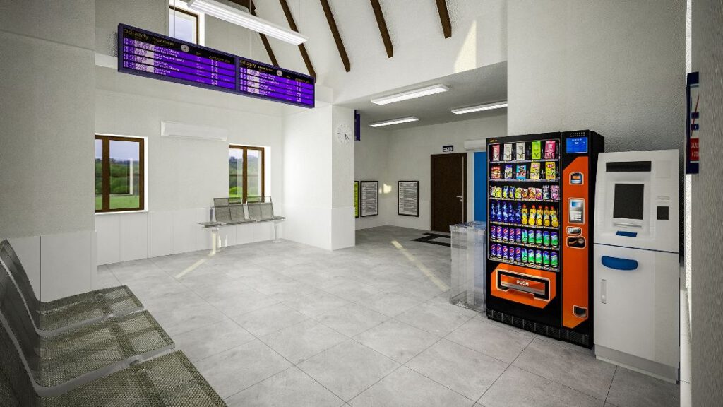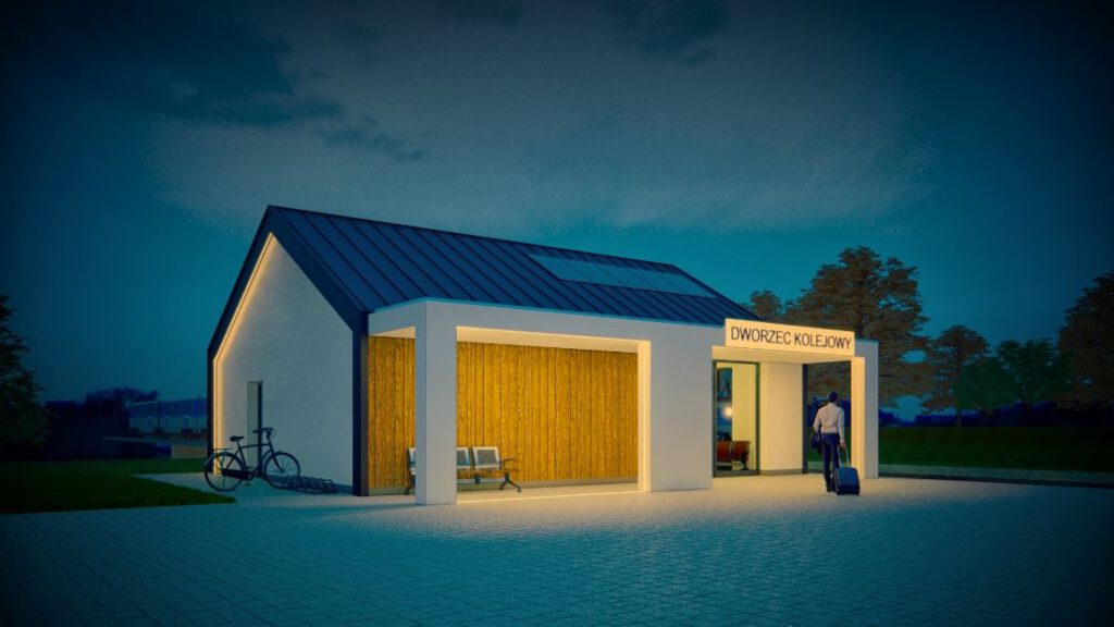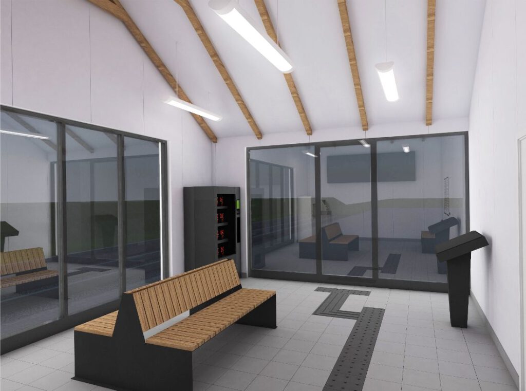 Równie interesująco będzie prezentować się wnętrze dworca. Do dyspozycji podróżnych zaprojektowano poczekalnię o powierzchni około 30 m kw., w której część ścian została przeszklona, a pozostałe pomalowane na biało. Stanowią one tak pożądany w nowoczesnej architekturze kontrast dla szarej posadzki pomieszczenia. Dopełnienie aranżacji wnętrza stanowi sufit, gdzie zdecydowano się na wyeksponowanie delikatnie zdobionych krokwi. To posunięcie dodaje utrzymanemu w odcieniach bieli i szarości wnętrzu nieco ciepła. Poza inspirującym wystrojem w poczekalni podróżni znajdą ławki z miejscem na bagaż, gabloty z rozkładem jazdy, zegar, elektroniczne tablice przyjazdów i odjazdów pociągów. W jej sąsiedztwie zaprojektowano toalety.
