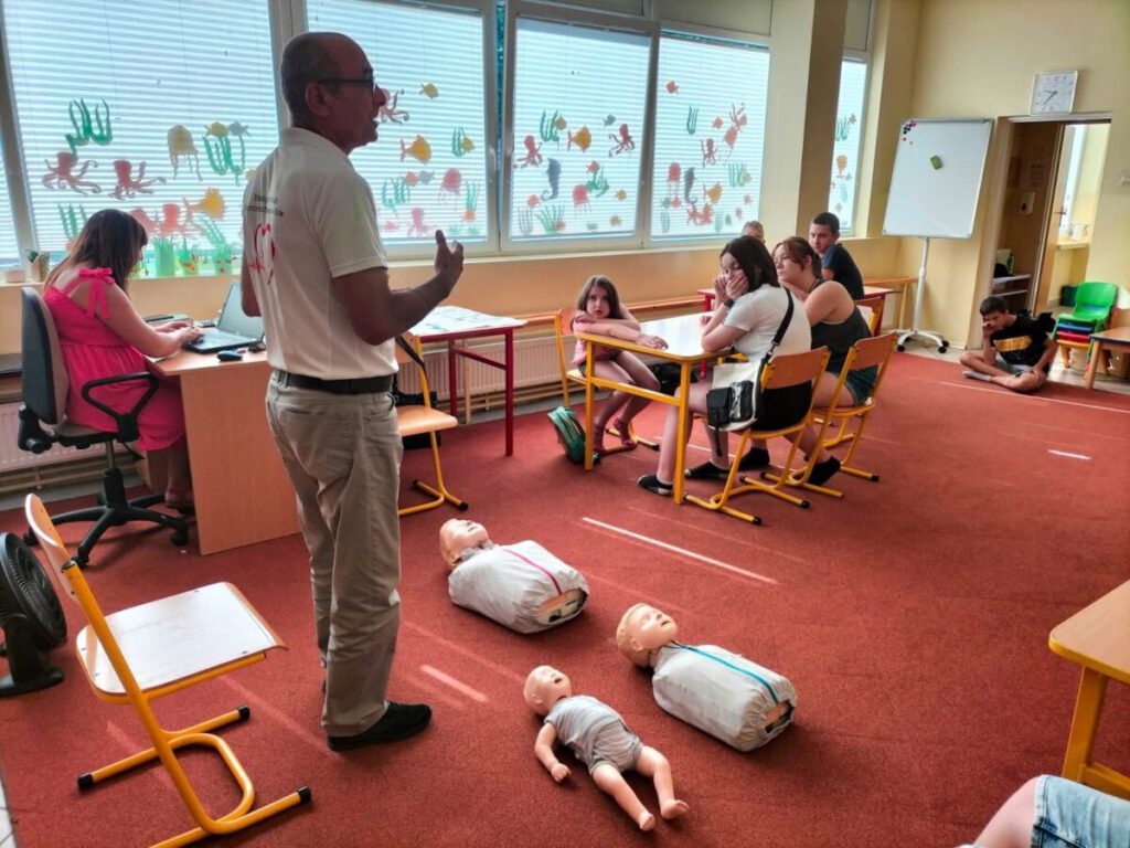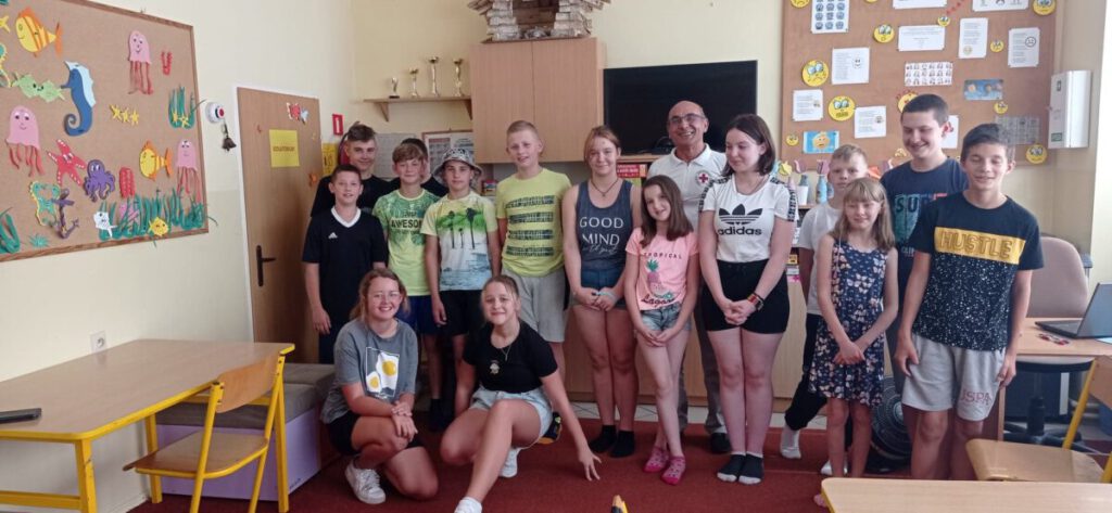 Uczestnicy półkolonii aktywnie brali udział w prelekcji, połączonej z warsztatami pana Andrzeja Lisa- Prezesa Oddziału Rejonowego PCK w Starym Sączu. Rekordzista w oddawaniu krwi zapoznał dzieci z tematyką krwiodawstwa jak i udzielania pierwszej pomocy przedmedycznej. Każdy z uczestników półkolonii mógł samodzielnie przećwiczyć podstawowy schemat udzielania pierwszej pomocy.