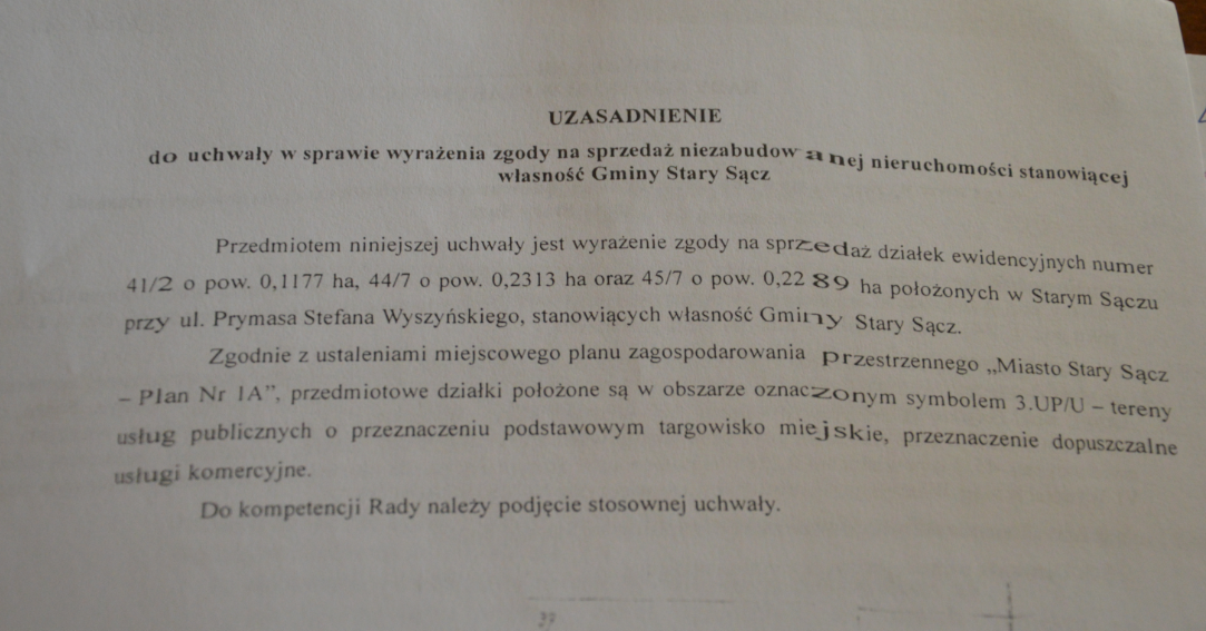 Radni Starego Sącza prawie jednogłośnie (przeciw był radny Robert Rams) uchwalili sprzedaż działek prywatnemu inwestorowi, zlokalizowanych przy nowej ulicy Prymasa Stefana Wyszyńskiego, nieopodal Miejskiego Targowiska. Radny Robert Rams apelował, aby zastanowić się nad sprzedażą, gdyż są to ostatnie działki, których właścicielem jest Gmina Stary Sącz. –To byłoby idealne miejsce na miejsca parkingowe podczas odbywających się jarmarków. „To niepoważne”-wtórował radny Szczepaniak.
