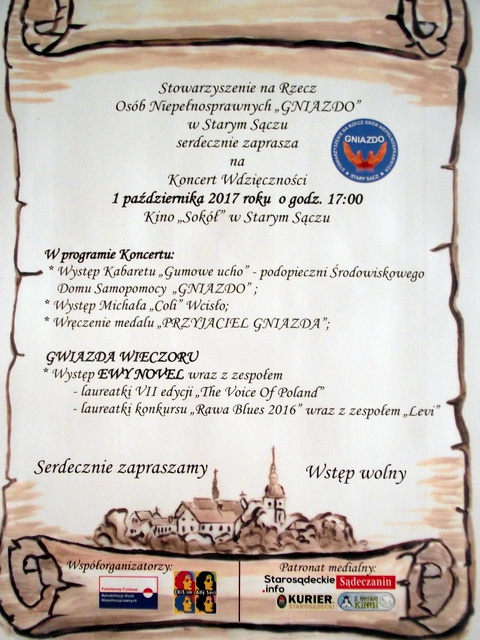Stowarzyszenie na Recz Osób Niepełnosprawnych „Gniazdo” serdecznie zaprasza na Koncert Wdzięczności, który odbędzie się już dzisiaj 1 października (niedziela) o godzinie 17:00 w Kinie Sokół w Starym Sączu. Po raz kolejny Stowarzyszenie zaprasza wszystkich darczyńców , dziękując tym samym za każdy dar serca ofiarowany ich Podopiecznym.