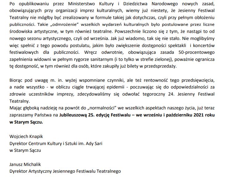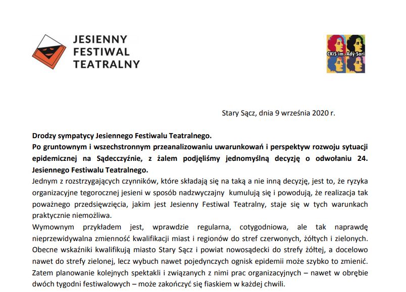 – Po gruntownym i wszechstronnym przeanalizowaniu uwarunkowań i perspektyw rozwoju sytuacji epidemicznej na Sądecczyźnie, z żalem podjęliśmy jednomyślną decyzję o odwołaniu 24. Jesiennego Festiwalu Teatralnego – poinformowali organizatorzy Jesiennego Festiwalu Teatralnego w Starym Sączu. Poniżej pełna treść oświadczenia.