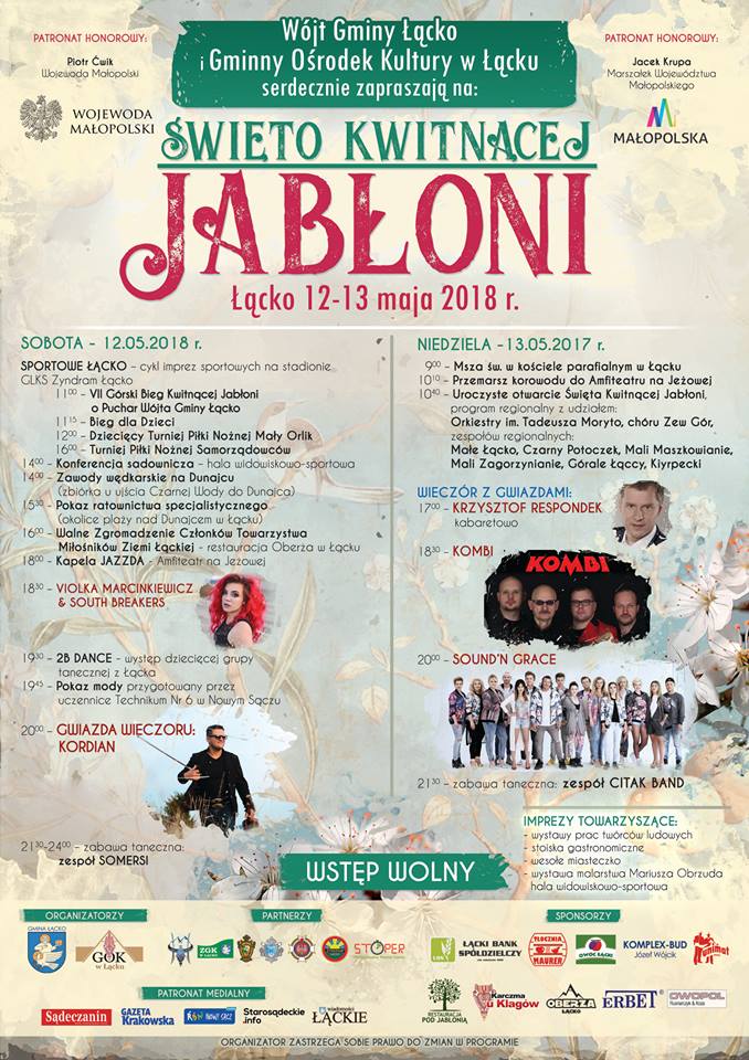 Wójt Gminy Łącko i Gminny Ośrodek Kultury w Łącku serdecznie zapraszają na Święto Kwitnącej Jabłoni, imprezę o najdłuższej tradycji w Małopolsce. Świętowanie potrwa dwa dni: 12-13 maja.