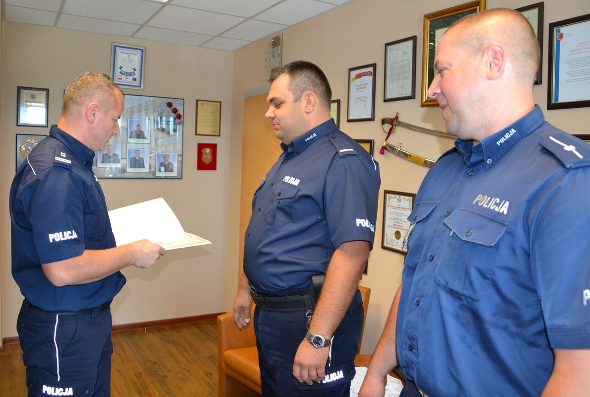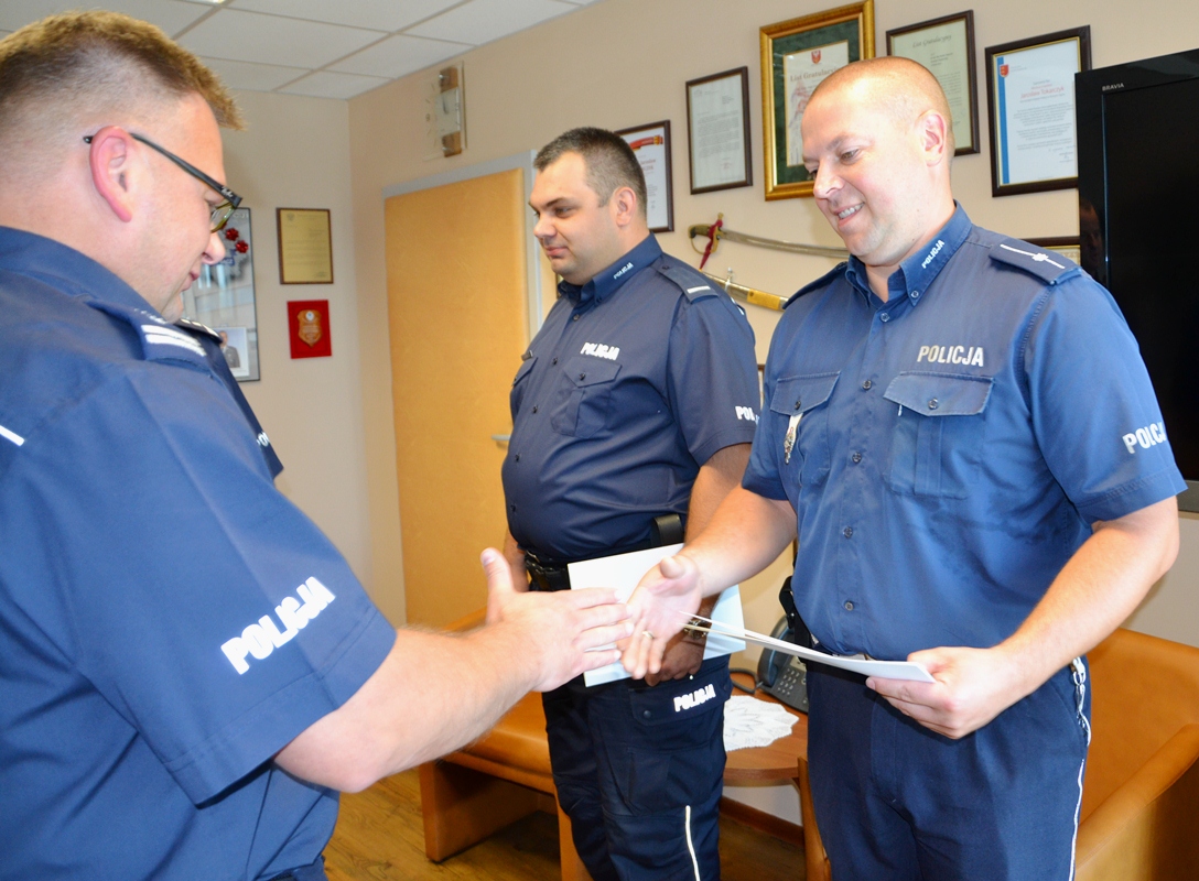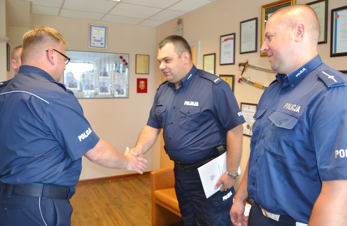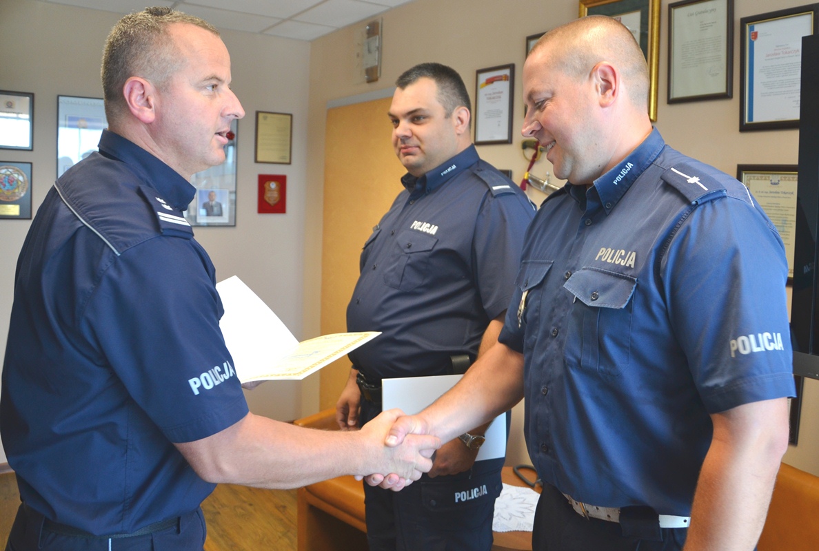 Komendant Miejski Policji w Nowym Sączu wraz ze swoim zastępcą pogratulował dzisiaj (19 lipca) starszemu posterunkowemu Jackowi Łukasikowi, który został Policjantem Roku 2017 w Małopolsce oraz młodszemu aspirantowi Józefowi Zarabskiemu – wyróżnionemu w tym plebiscycie.