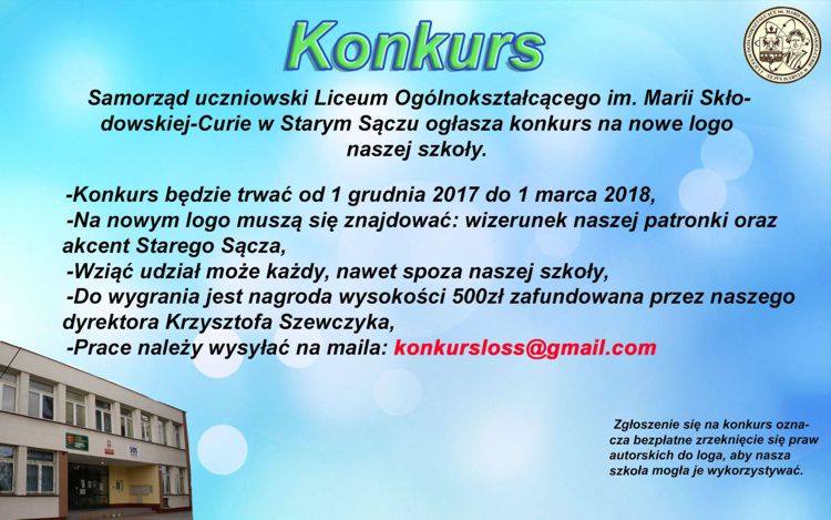 Samorząd Uczniowski Liceum Ogólnokształcącego im. Marii Skłodowskiej-Curie w Starym Sączu ogłasza konkurs na nowe logo szkoły Konkurs trwa do 1 marca 2018. Zgłoszenie może wysłać każdy na mail konkursloss@gmail.com