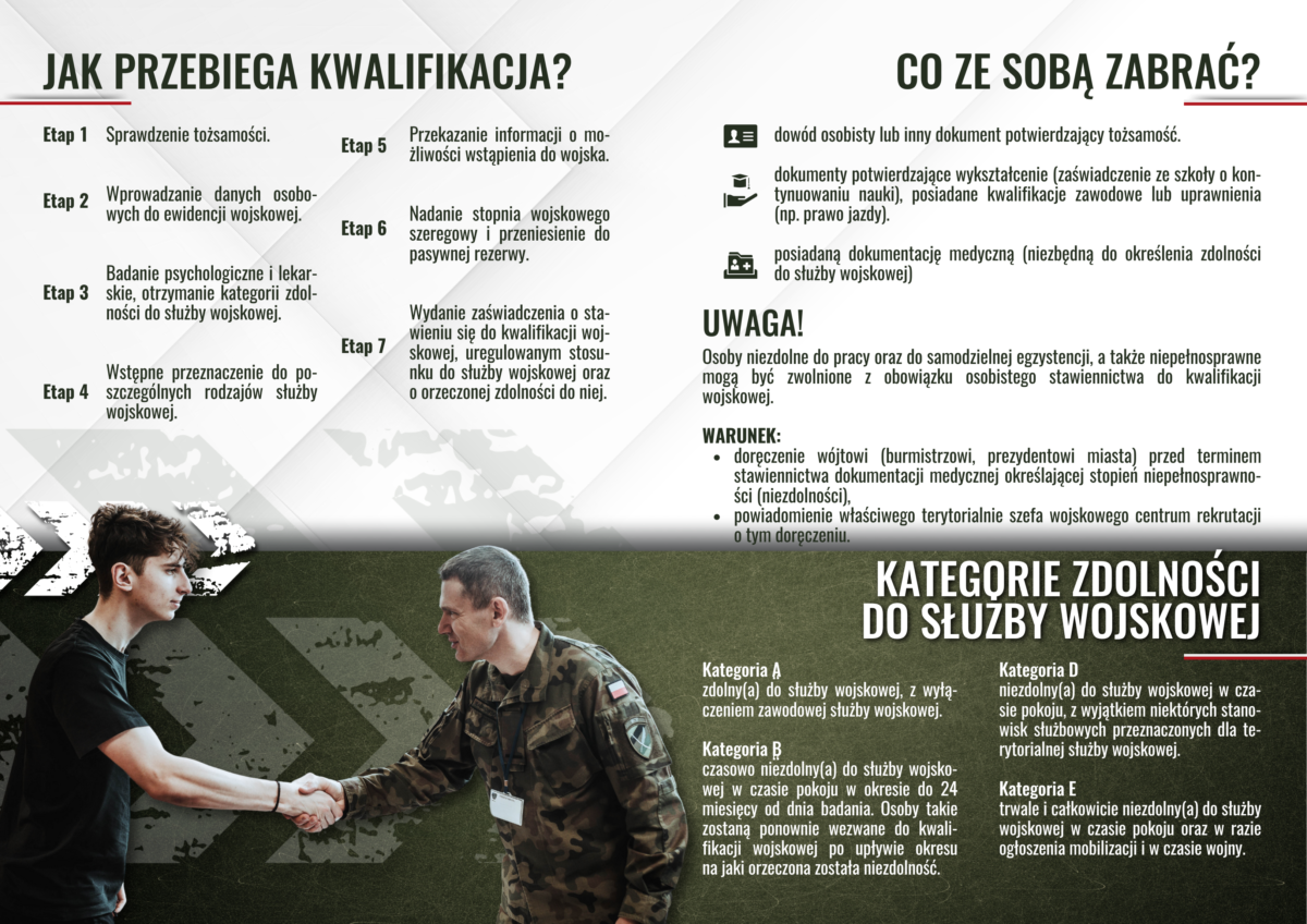 Kwalifikacja wojskowa to nie pobór ani mobilizacja. To coroczne przedsięwzięcie administracyjne, którego celem wprowadzenie danych do ewidencji wojskowej oraz określenie zdolności fizycznej i psychofizycznej do czynnej służby wojskowej.