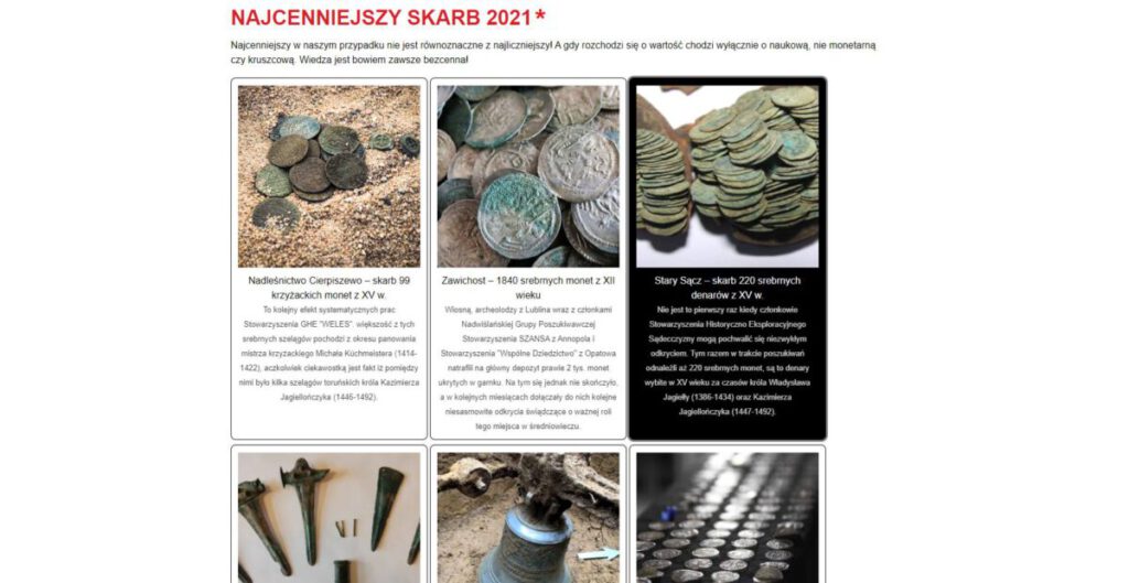 Członkowie Stowarzyszenia Historyczno Eksploracyjnego ze Starego Sącza zostali nominowani do prestiżowej nagrody. W plebiscycie „Archeologiczne sensacje 2021 roku” walczą o zdobycie tytułu najcenniejszego skarbu roku. Dostrzeżone zostało odkrycie 220 srebrnych denarów z XV wieku. O tym czy uda im się zdobyć nagrodę zadecydują internauci, którzy mogą oddać głos na wybrane znalezisko. Plebiscyt organizowany jest przez czasopismo popularnonaukowe „Archeologia żywa”. Nagroda przyznawana jest za odkrycie najcenniejszego skarbu w 2021 roku.