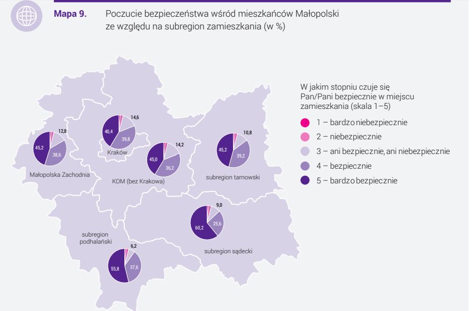 Czy w Małopolsce można czuć się bezpiecznie? Odpowiedź brzmi: jak najbardziej! Takiego zdania jest blisko 85 proc. mieszkańców naszego regionu. Biorąc pod uwagę wyniki ankiet w poszczególnych subregionach, najlepiej wypadło Podhale – tu odpowiedź „bezpiecznie” i „bardzo bezpiecznie” wybrało blisko 94 proc. ankietowanych. W dalszej kolejności są: Sądecczyzna (85,8 proc.), subregion tarnowski (84,4 proc.), Małopolska Zachodnia (83,8 proc.), Krakowski Obszar Metropolitalny (81,2 proc.) i sam Kraków (80,2 proc.).