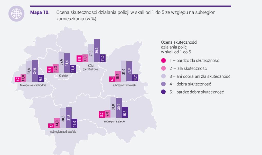 Jedynie co dziewiąty mieszkaniec regionu ocenił działanie policji jako „bardzo skuteczne”. Niewiele mniej (7,3%) odpowiedziało, że charakteryzują się one „bardzo złą skutecznością”.