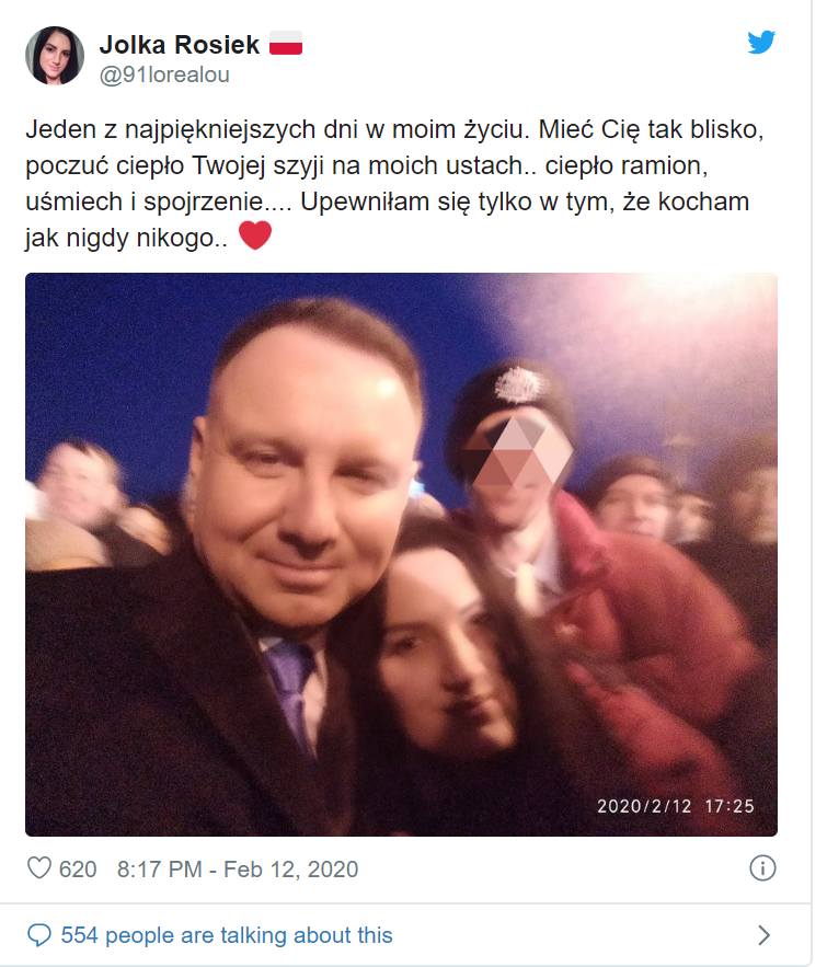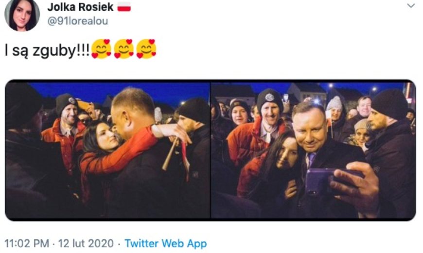 Podczas wizyty w Zakliczynie na prezydenta RP Andrzeja Dudę rzuciła się młoda dziewczyna. W internecie pochwaliła się kilkoma zdjęciami. Pierwsze z nich okrasiła odważnym wpisem. ″Mieć Cię tak blisko, poczuć ciepło Twojej szyji na moich ustach.. ciepło ramion, uśmiech i spojrzenie…. Upewniłam się tylko w tym, że kocham jak nigdy nikogo.. ″ – napisała Jolka.