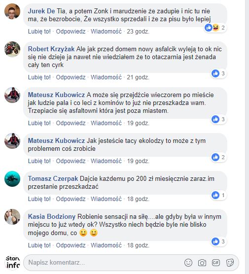 Wypowiedź burmistrza z ubiegłego tygodnia podczas posiedzenia Komisji : „Ja nadal podkreślam, że dla mnie najważniejsi są mieszkańcy. Mieszkańcy bardzo szeroko pojęci. Jeżeli będzie szkodliwość uzasadniona to pochylimy się nad tematem asfaltowni -komentuje burmistrz- Może trzeba znaleźć środki pośrednie. Ja jestem otwarty na rozmowy (…) Przedsiębiorca rocznie wpłaca do gminnej kasy 120 tysięcy złotych samego czynszu. Nie przedkładam zdrowia mieszkańców nad pieniądze, żeby była jasność. Chodzi mi o to, że to nie są sprawy nad którymi nie trzeba się zastanawiać. Gdybym ja na każdy sygnał o uciążliwości w ten sposób reagował to w gminie byłoby piekło. To nie jest zarzut, że chce się przyjrzeć. To jest zaleta. Nie lokalizowałem tej działalności na terenach ładnych. Badaliśmy i sprawdzaliśmy teren. Działalność jest zlokalizowana obok składowiska odpadów i betoniarni. Nie wydzierżawiliśmy tego na 10 lat, tylko dwa razy po 2 lata, żeby mieć rękę na pulsie i kontrolę nad przedsiębiorcą. Nie ma mowy o zanieczyszczeniu wód. To była zachowawcza decyzja, której cały czas się przyglądamy. Gdzieś ten asfalt musimy robić. Nie da się go tak łatwo przywieść, bo asfalt musi być gorący. To nie jest rzecz przyjemna. Wolałbym, żeby lokalizowały się u nas firmy i nowoczesne technologie, ale nie zawsze się da.