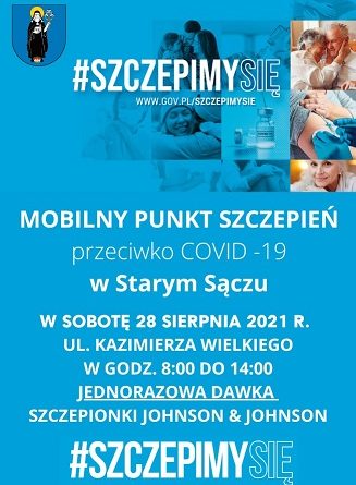 W sobotę 28 sierpnia 2021 r. w godz. od 8.00 do 14.00 będzie możliwość zaszczepienia się w Starym Sączu jednodawkową szczepionką Johnson & Johnson przeciwko COVID-19.