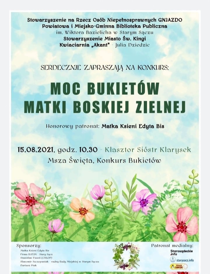 Po raz kolejny w Starym Sączu Stowarzyszenie na Rzecz Osób Niepełnosprawnych Gniazdo organizuje KONKURS na najpiękniejszy bukiet zielny. Współorganizatorami tego wydarzenia jest: Powiatowa i Miejsko-Gminna Biblioteka Publiczna im Wiktora Bazielicha w Starym Sączu, Stowarzyszenie Miasto św Kingi oraz Kwiaciarnia „Akant” Julia Dziedzic w Starym Sączu.