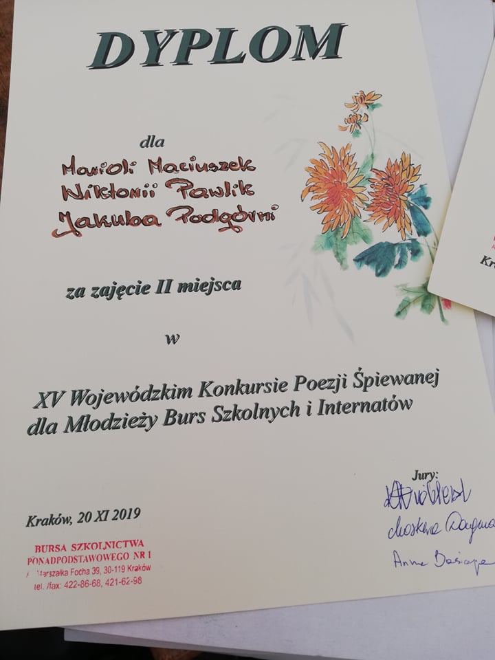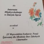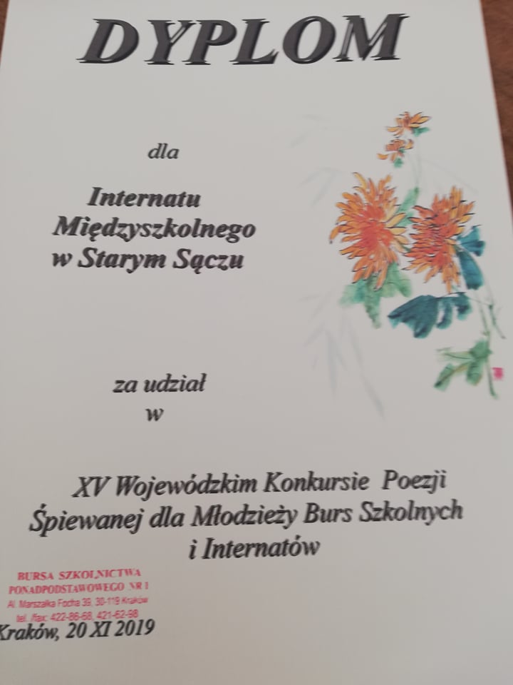 20 listopada 2019 roku w Krakowie odbył się XV Wojewódzki Konkurs Poezji Śpiewanej dla Młodzieży Burs Szkolnych i Internatów. Młodzież z Międzyszkolnego Internatu w Starym Sączu wyśpiewała II miejsce. To bardzo duży sukces, zważywszy na fakt, że młodzi rywalizowali z uczniami ze szkół muzycznych.