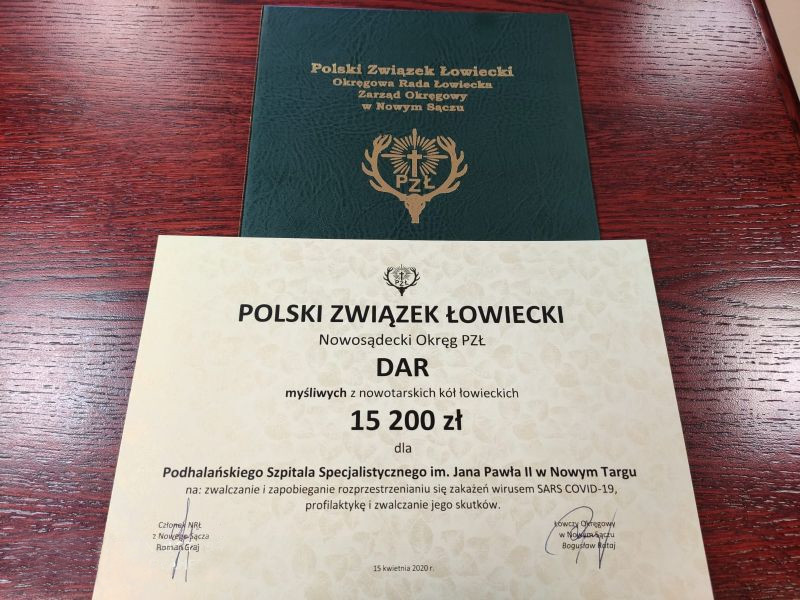 W odpowiedzi na apel Zarządu Okręgowego Polskiego Związku Łowieckiego w Nowym Sączu, członkowie kół łowieckich okręgu wsparli finansowo zakup środków ochrony osobistej oraz sprzętu i leków wykorzystywanych w zapobieganiu i zwalczaniu zakażeń koronawirusem  COVID-19.