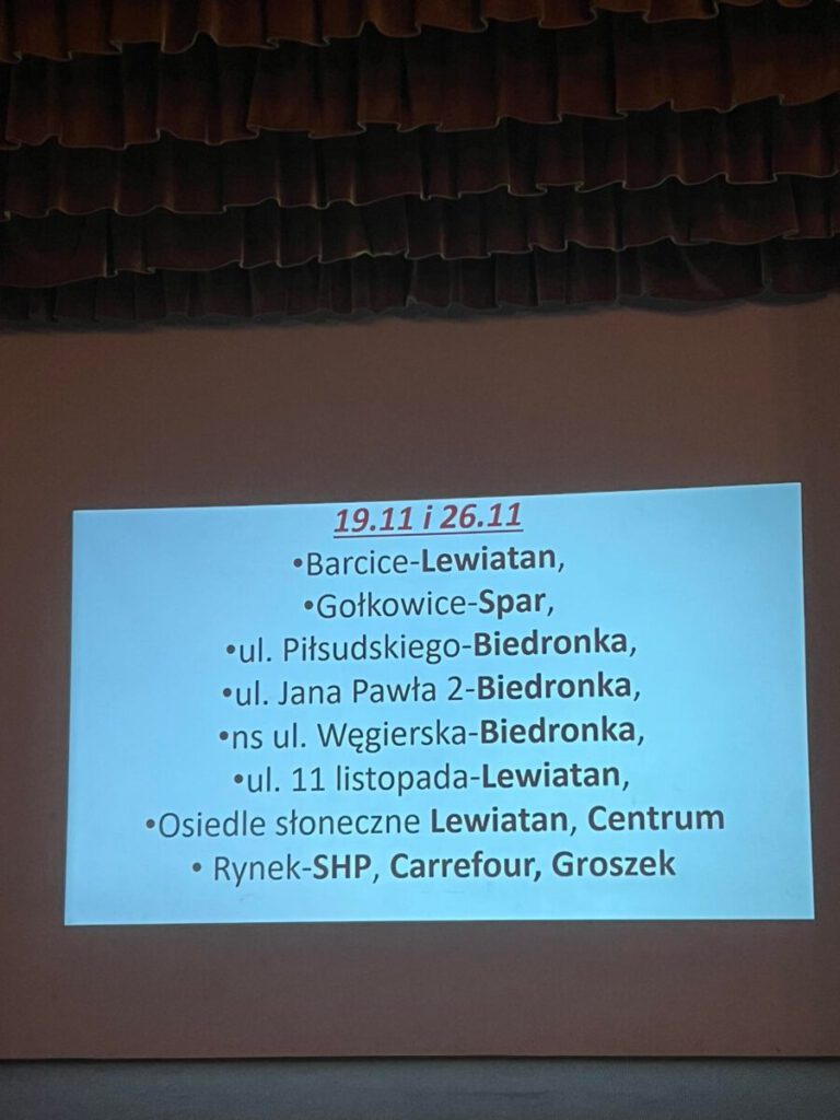 W Szkole Podstawowej nr 1, Szkole Podstawowej nr 2 oraz Liceum Ogólnokształcącym i Zespole Szkół odbywają się zbiórki darów. I tu należy zaznaczyć, że już od kilku lat dzięki przyjaznemu stosunkowi dyrekcji tych szkół co roku udaje się realizować “Szlachetną paczkę”.
