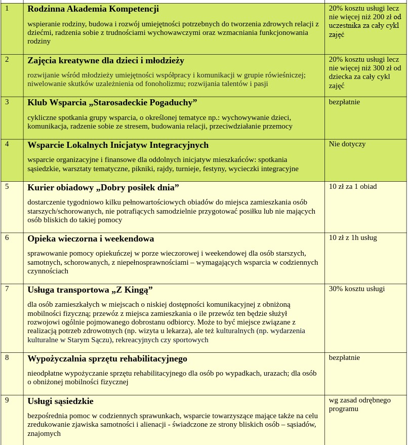 Wstępny katalog usług, które mogą zostać wprowadzone, został już opracowany. Wśród propozycji pojawiają się m.in. działania wspierające rodziny, osoby starsze i z niepełnosprawnościami, usługi asystenckie, porady specjalistyczne, wsparcie dla opiekunów osób niesamodzielnych czy inicjatywy integrujące lokalną społeczność.