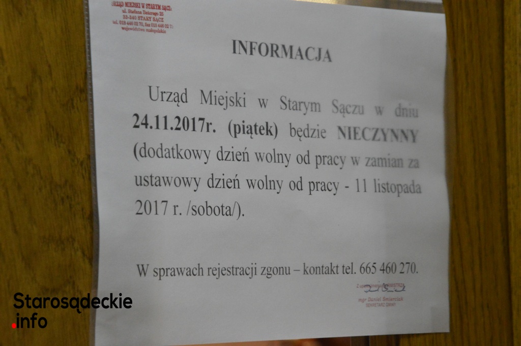 W najbliższy piątek (24.11.2017) Urząd Miejski w Starym Sączu będzie nieczynny. W związku z dodatkowym dniem wolnym od pracy przysługującym w zamian za ustawowy dzień wolny od pracy, który przypadł w sobotę (11 listopada), urzędnicy będą mieć wolne.