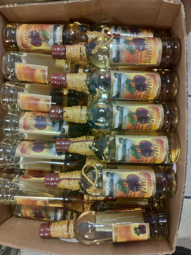 Policjanci na jednej z posesji w Nowym Targu znaleźli 210 butelek półlitrowych z wysokoprocentowym alkoholem tzw. łąckiej śliwowicy (bądź jej podróbki) bez wymaganych znaków akcyzowych oraz kilka sztuk kastetów.