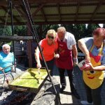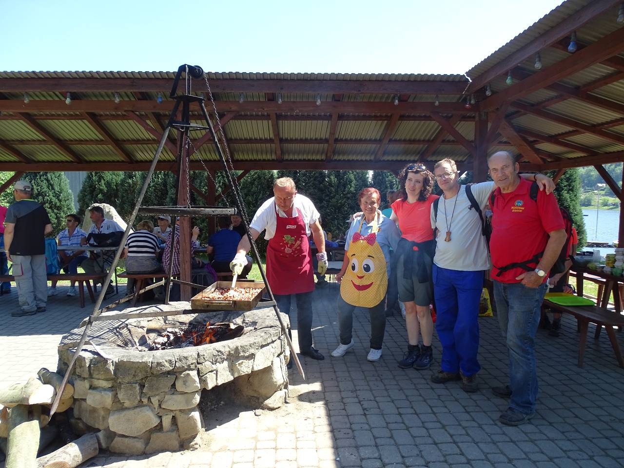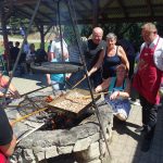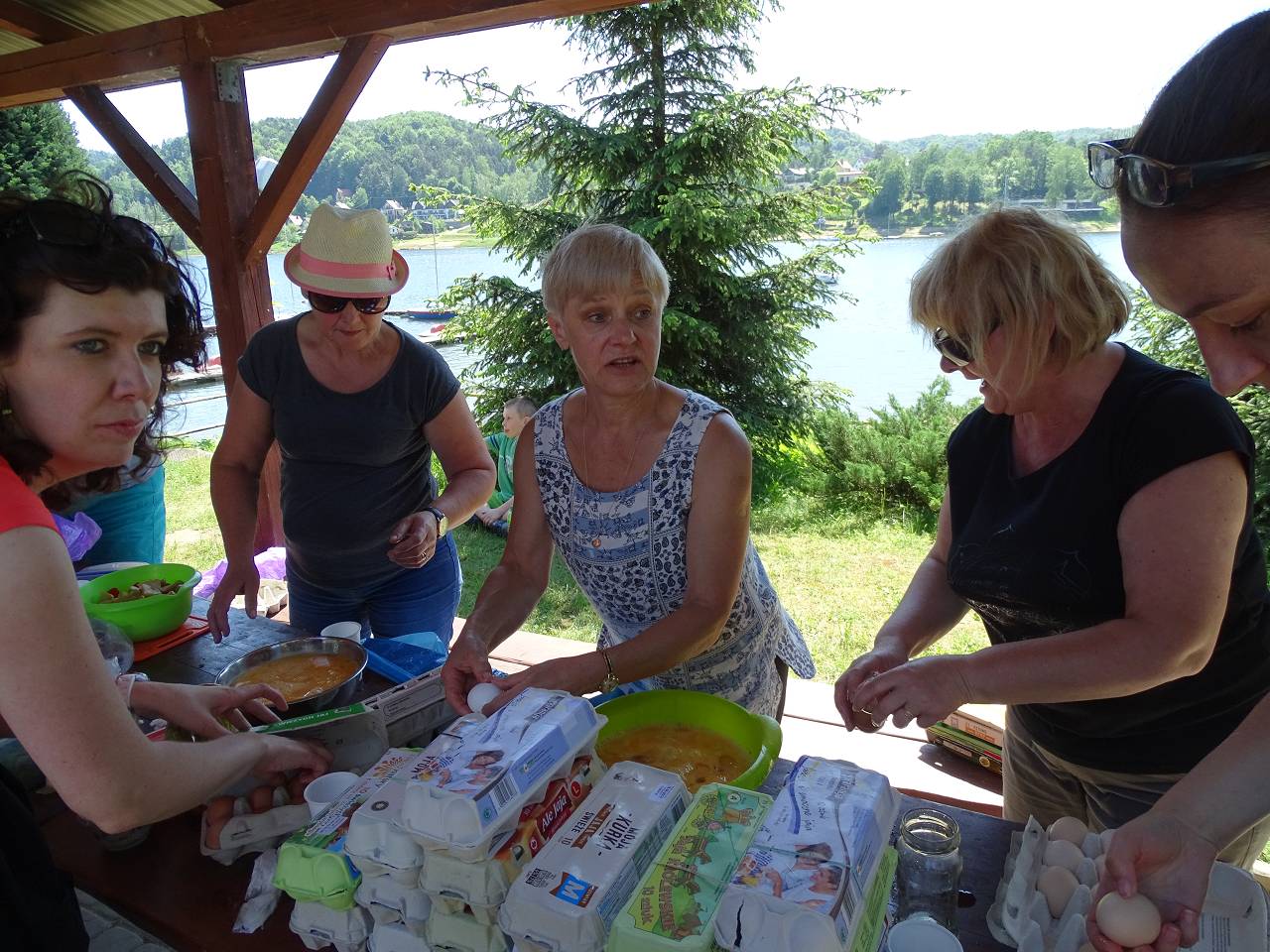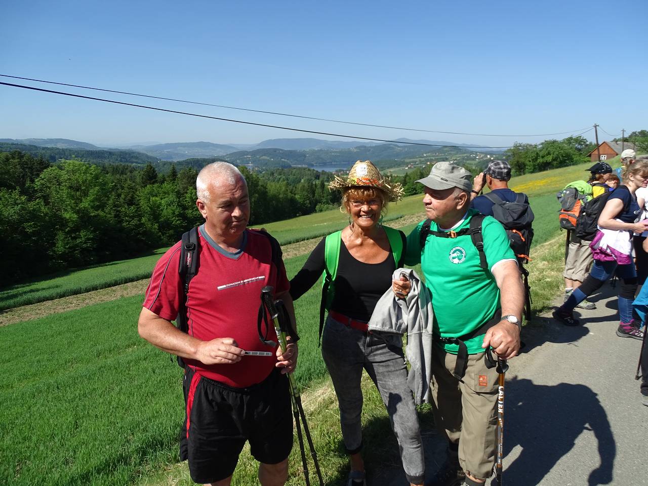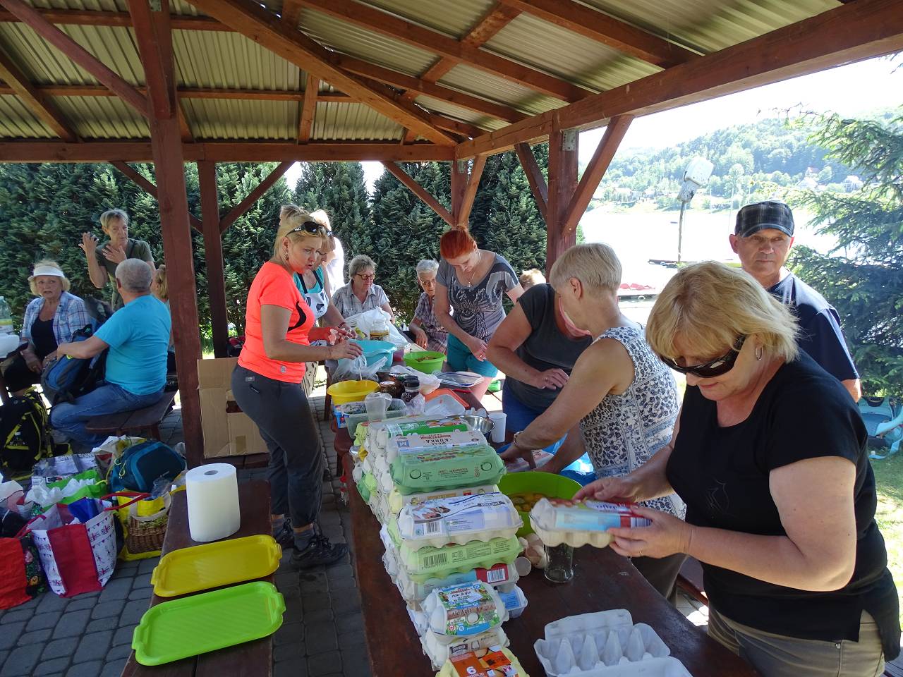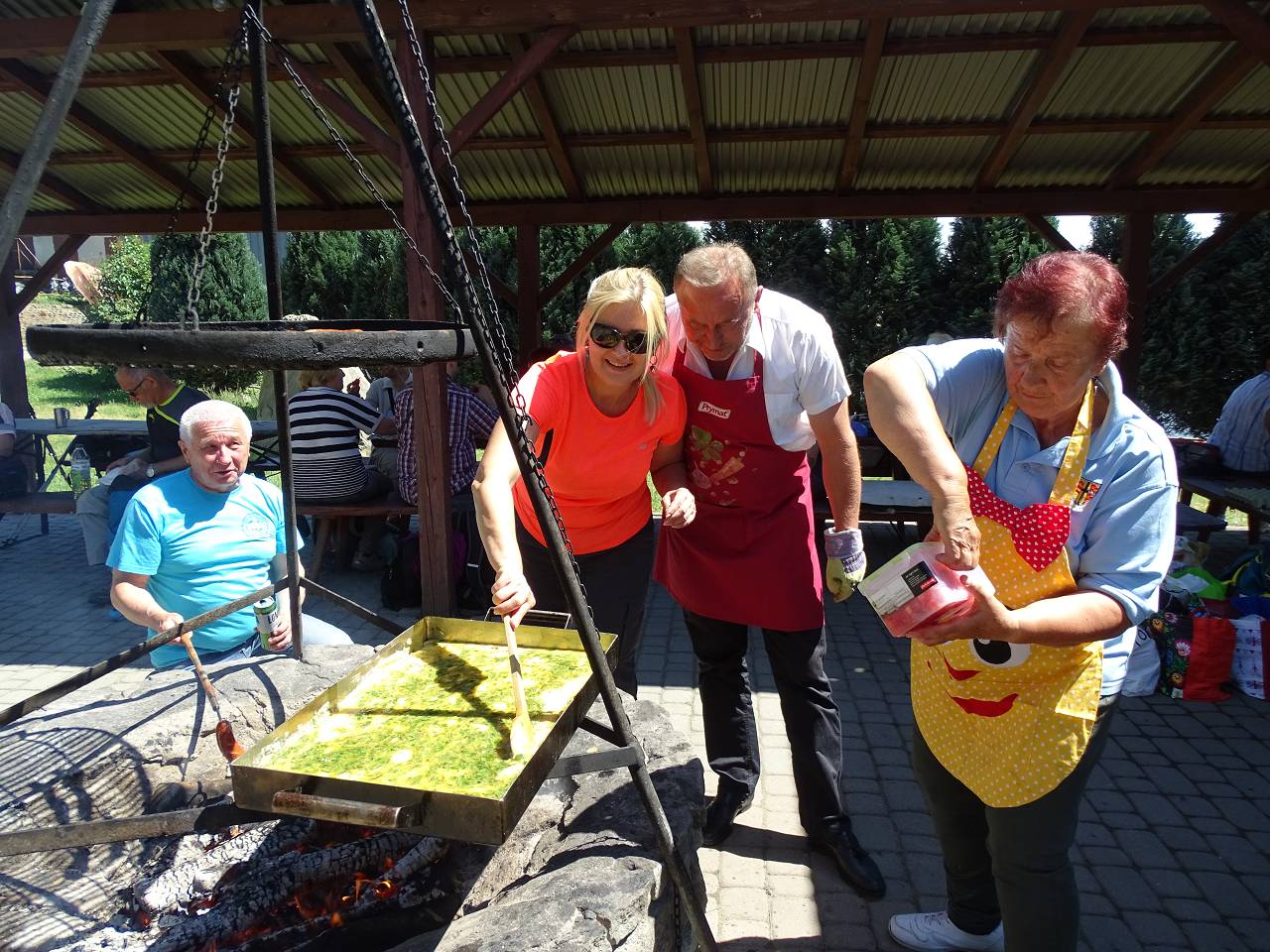 Na rozgrzewkę zaplanowany był spacer odcinkiem żółtego szlaku z Posadowej Góry przez Majdan (512 m.) do Bartkowej. Jego mankamentem są długie odcinki prowadzące asfaltowymi drogami, jednak widoki na jezioro, Beskid Wyspowy i majaczące w oddali Tatry w pełni rekompensują wspomniane słabości. Odcinek nie był długi ale w zupełności wystarczył by rozbudzić apetyt na wiosenną jajecznicę pachnącą boczkiem szczypiorkiem i lubczykiem. Jej usmażenie dla 150 osób wymagało dobrej organizacji ale mamy w tym pewne doświadczenie, bo zdarzyło się nam już kiedyś nakarmić 200 osób.