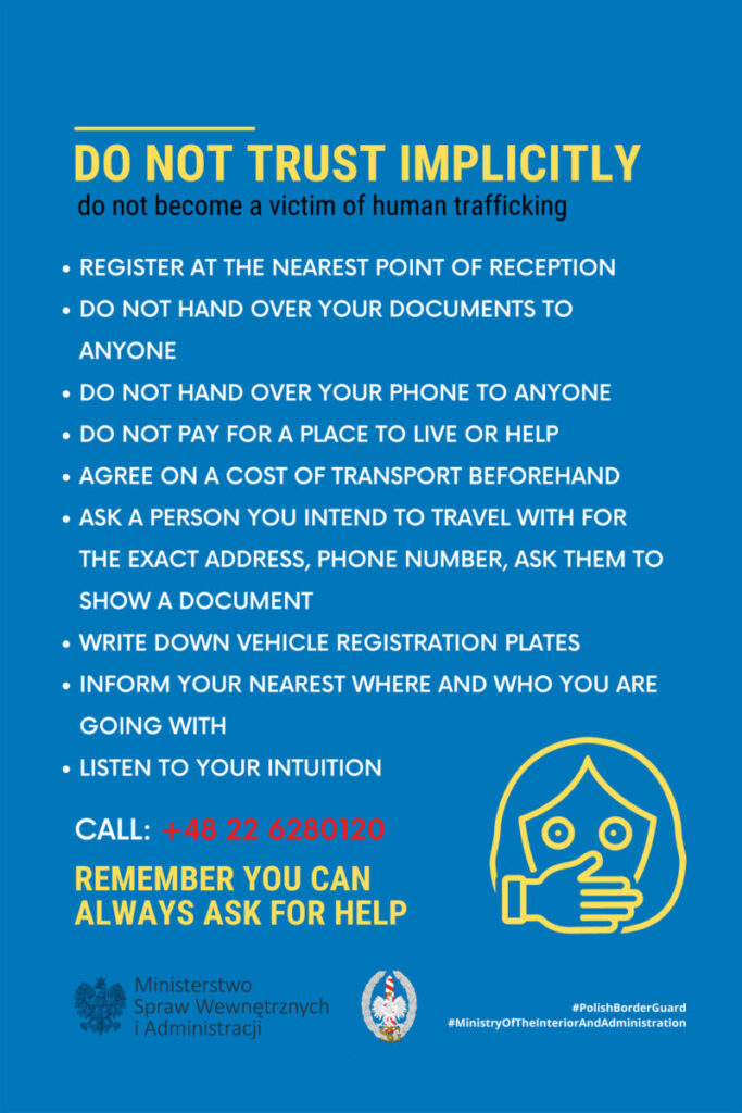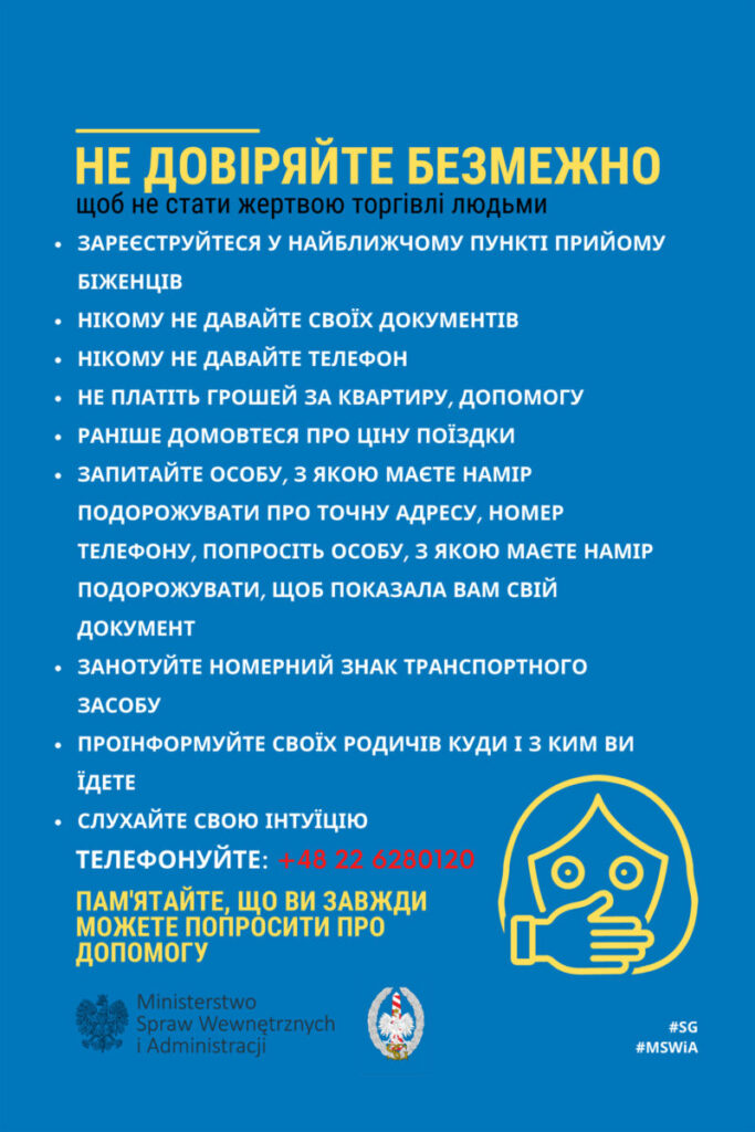 Biuro Prezydialne Komendy Głównej Straży Granicznej i Departament Spraw Międzynarodowych i Migracji MSWiA opracowali więc ulotkę skierowaną do obywateli Ukrainy przekraczających granice polsko-ukraińską. W przypadku jakiegokolwiek podejrzenia handlu ludźmi – obywatele Ukrainy, jak również wszystkich innych państw mogą prosić o pomoc Krajowe Centrum Informacyjno-Konsultacyjne.