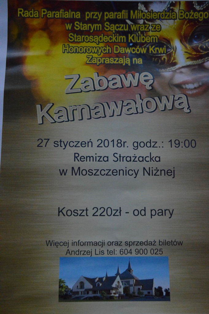 Już 27 stycznia o godzinie 19:00 w OSP Moszczenica Niżna rozpocznie się Zabawa Karnawałowa. Wszystkich zainteresowanych serdecznie zaprasza Rada Parafialna z kościoła Miłosierdzia Bożego w Starym Sączu i Starosądecki Klub Honorowych Dawców Krwi.