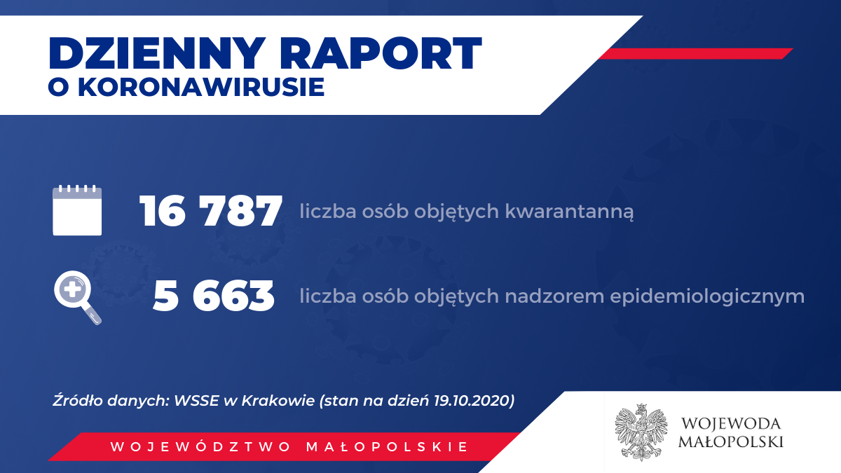 Ostatnie badania laboratoryjne potwierdziły zakażenie koronawirusem SARS-CoV-2 u kolejnych 1492 osób w Małopolsce:, z Krakowa (534 osoby), powiatu suskiego (81 osób), nowotarskiego i limanowskiego (po 80 osób), krakowskiego (79 osób), myślenickiego (65 osób), wielickiego (63 osoby), wadowickiego (60 osób), nowosądeckiego i bocheńskiego (po 52 osoby), Tarnowa (45 osób), powiatu tatrzańskiego (40 osób), miechowskiego (38 osób), tarnowskiego (37 osób), brzeskiego (33 osoby), oświęcimskiego (31 osób), olkuskiego (28 osób), gorlickiego (27 osób), chrzanowskiego (24 osoby), Nowego Sącza (20 osób), powiatu dąbrowskiego (14 osób), proszowickiego (9 osób). Aktualnie 31 osób jest hospitalizowanych, pozostałe przebywają w izolacji.