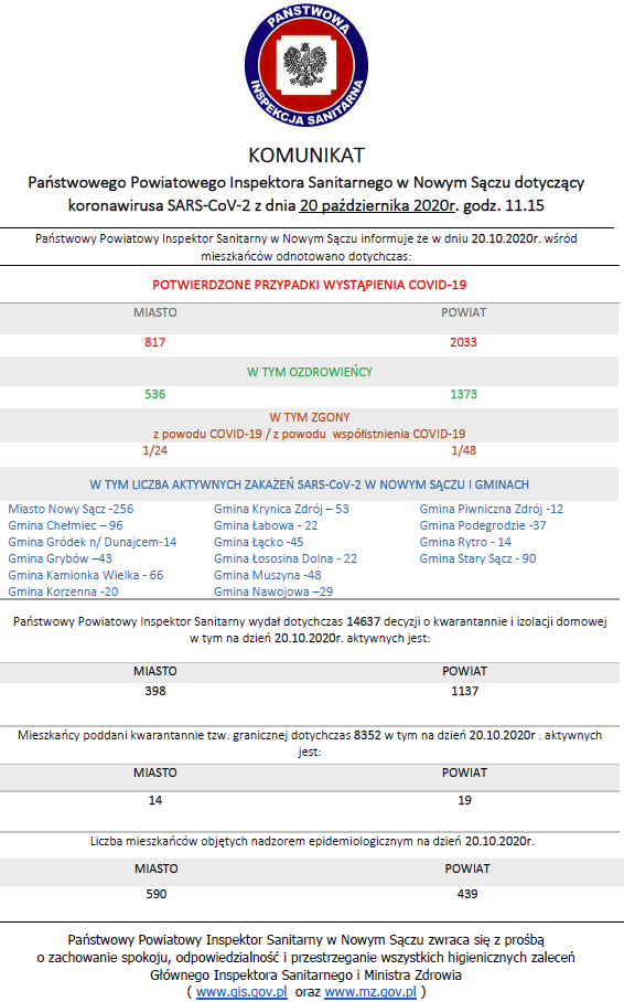 POWIAT NOWOSĄDECKI i MIASTO NOWY SĄCZ -AKTYWNE ZAKAŻENIA: