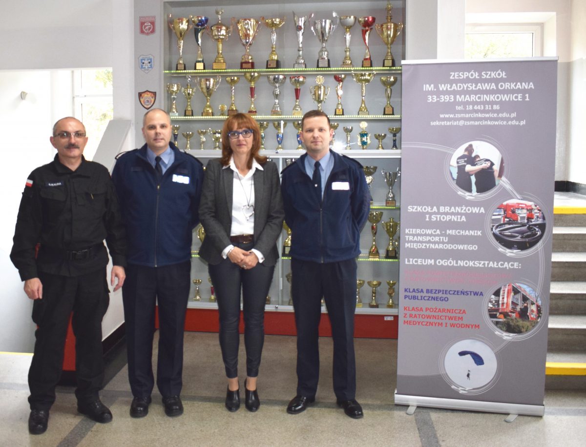 Stażyści udali się także do Zespołu Szkół im. Władysława Orkana w Marcinkowicach, gdzie spotkali się z uczniami klas mundurowych, ich nauczycielem Grzegorzem Kaliną oraz Dyrektorem Szkoły Alicją Wąsowicz. Z uczniami klas I i II o profilu bezpieczeństwo publiczne, rozmawiali o służbie Policji w Polsce i Gardy w Irlandii. Podczas spotkania wymieniali się informacjami m.in. na temat systemów szkolenia i zasad przyjęcia do formacji.