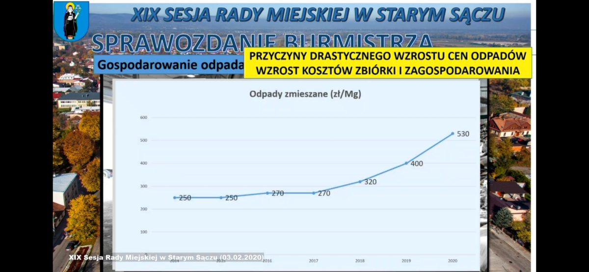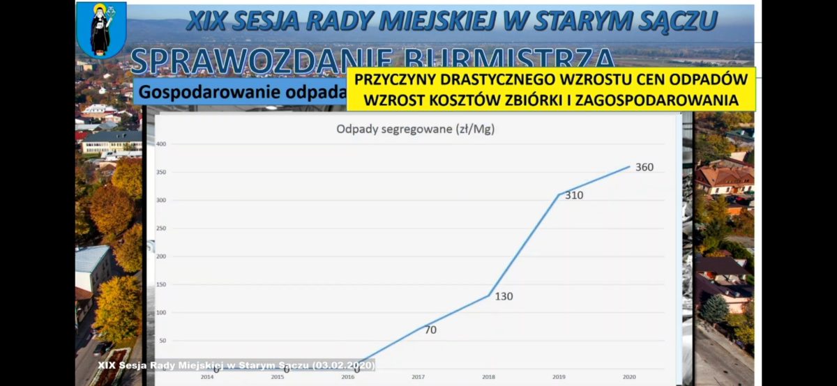 Dzisiaj (03.02.2020) Radni Starego Sącza będą głosować nad uchwałą w sprawie podwyżek opłat za wywóz śmieci. Według projektu od 1 kwietnia 2020 roku zapłacimy za wywóz śmieci 100% więcej więc 20 zł od osoby w przypadku gdy zadeklarujemy wywóz odpadów zielonych. Jeżeli w deklaracji zgłosimy, że odpady zielone będziemy sami zagospodarowywać czyli kompostować to zapłacimy 18 zł od osoby.