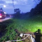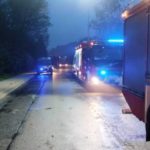 Jeden poszkodowany znajdował się poza pojazdem i był przytomny. Drugi poszkodowany znajdował się w pojeździe i był nieprzytomny. Na miejscu byli świadkowie zdarzenia, którzy próbowali wyciągnąć poszkodowanego z pojazdu. Działania strażaków polegały na zabezpieczeniu miejsca zdarzenia, przystąpieniu do ewakuacji poszkodowanego znajdującego się w pojeździe, odłączeniu klem akumulatora oraz rozpoczęciu udzielania kwalifikowanej pierwszej pomocy poszkodowanemu znajdującemu się poza pojazdem. Na ziemi w okolicach pojazdu leżały izolowane linki energetyczne od oświetlenia ulicznego, które były prawdopodobnie pod napięciem. Droga była zablokowana.Ewakuowano poszkodowanego z pojazdu po odcięciu pasów bezpieczeństwa i przeniesiono go w miejsce bezpieczne. Udzielono kwalifikowanej pierwszej pomocy. Po przyjeździe na miejsce karetki przekazano obydwu poszkodowanych ratownikom medycznym. Osoba znajdująca się poza pojazdem została zabrana do szpitala. Drugiej osoby ewakuowanej z samochodu po kilkudziesięciu minutach reanimacji nie udało się uratować. Na miejsce dojechały dodatkowe patrole Policji. Na miejsce przybył prokurator oraz pracownicy zakładu pogrzebowego, którzy zabrali ciało. Zastęp OSP usunął zarośla przy użyciu pilarki, aby umożliwić zabranie pojazdu przez lawetę. Działania strażaków trwały ponad cztery godziny.