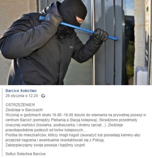 W Barcicach (gmina Stary Sącz) w sobotę, 25 stycznia, między godziną 16:00-18:00 doszło do kradzieży z włamaniem. Sołtys apeluje do mieszkańców o zachowanie ostrożności i pomoc w ujęciu złodziei.