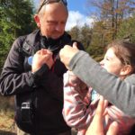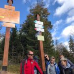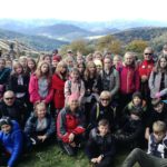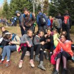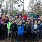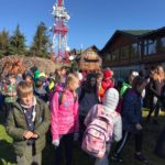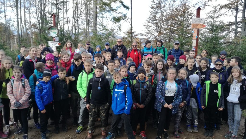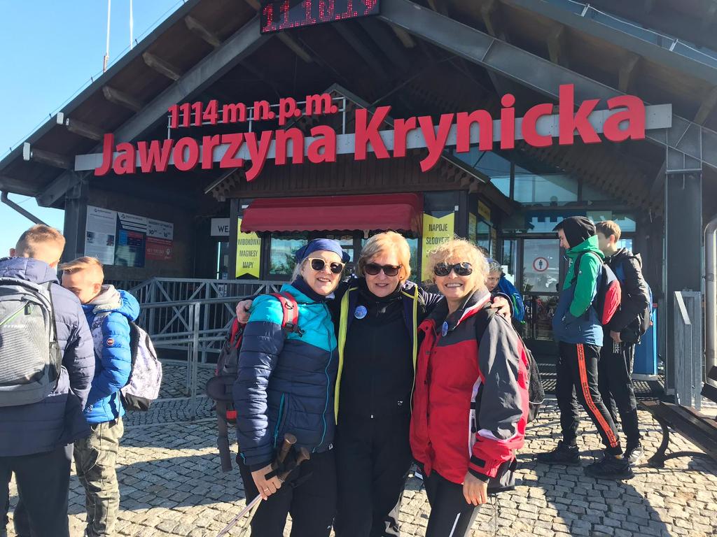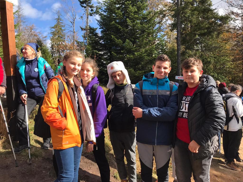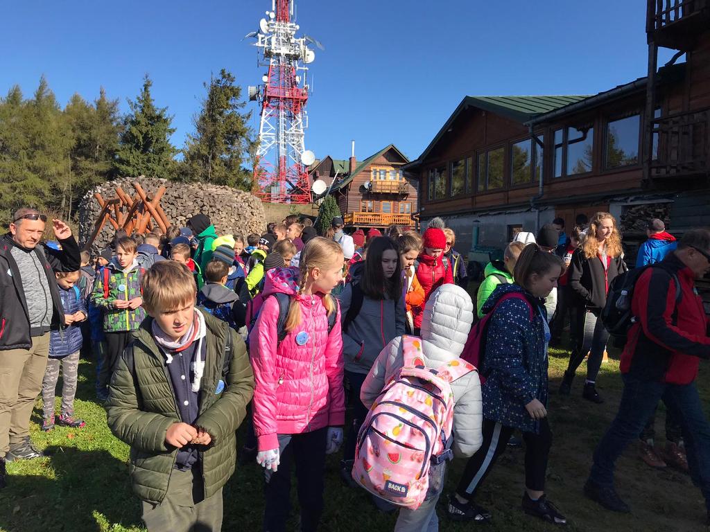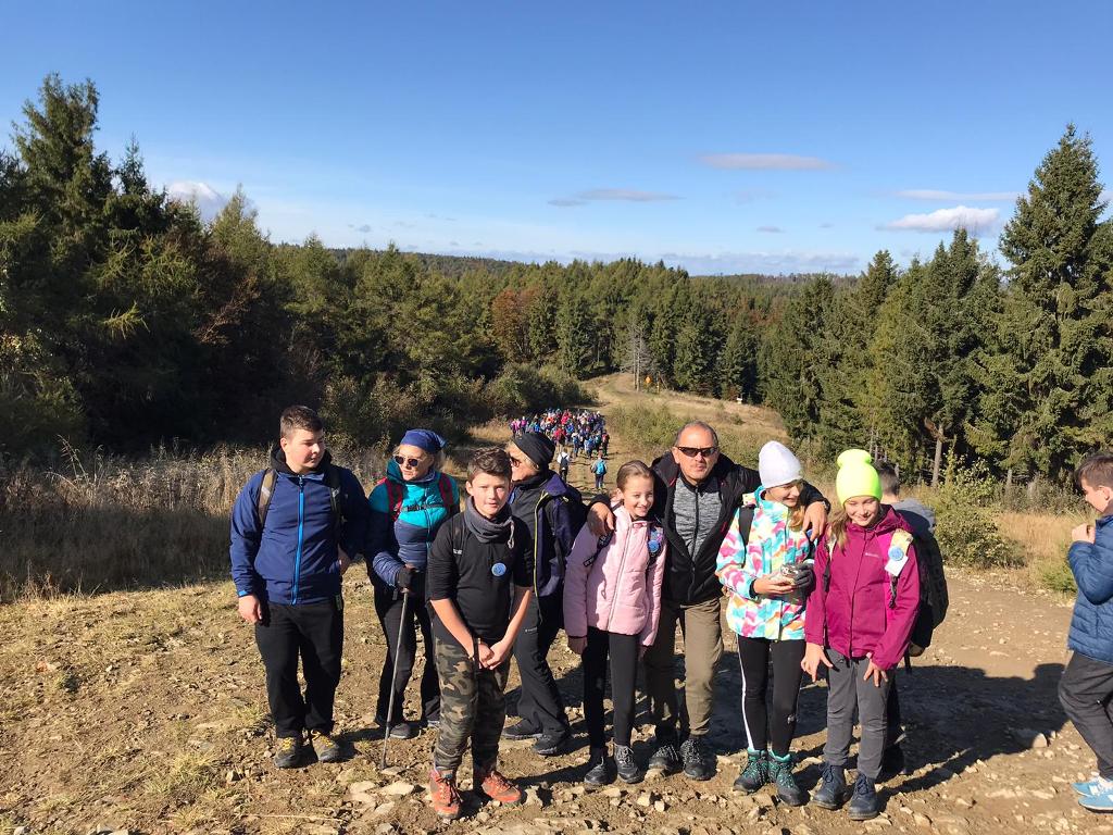 Wyruszyliśmy więc rano, 11 października. Stawili się wszyscy chętni do wędrówki – 81 uczniów i opiekunowie. Po dotarciu do Krynicy Zdrój wyjechaliśmy koleją gondolową na Jaworzynę Krynicką, a tam …. co za widoki! Tatry ośnieżone jak na wyciągnięcie ręki, złote, czerwone i pomarańczowe lasy Beskidów w jesiennym słońcu, niebo niebieskie jak szafir! O pasmach górskich, które obserwowaliśmy, przyrodzie beskidzkiej i historii regionu ciekawie opowiadał nam przewodnik beskidzki pan Franciszek Homa, który towarzyszył nam przez cały rajdowy dzień. Trasa naszej wędrówki przebiegała malowniczym szlakiem Beskidu Sądeckiego. Z Jaworzyny Krynickiej 1114 m.p.m. przez górę Runek kierowaliśmy się w stronę schroniska Bacówka nad Wierchomlą. Po drodze zatrzymaliśmy się przy kapliczce wydrążonej w pniu starego, świerka. Tu minutą ciszy uczciliśmy pamięć naszego śp. dyrektora Zdzisława Wojnarowskiego. W górach szczególnie czuliśmy Jego obecność. Był z nami, w naszych wspomnieniach. Zapaliliśmy pamiątkowy, rajdowy znicz, chwila zadumy…