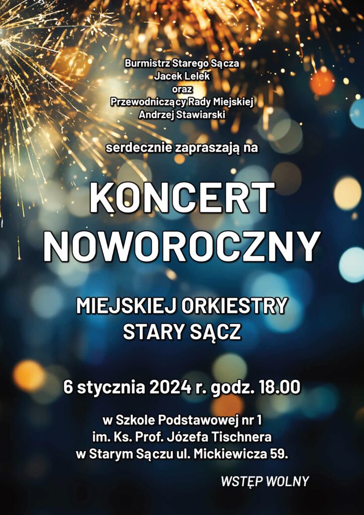 Jacek Lelek Burmistrz Starego Sącza i Andrzej Stawiarski Przewodniczący Rady Miejskiej w Starym Sączu zapraszają na koncert noworoczny w wykonaniu Miejskiej Orkiestry Stary Sącz pod batutą Sławomira Drzyzgi, który odbędzie się 6 stycznia o godzinie 18:00 w Szkole Podstawowej nr 1 w Starym Sączu.