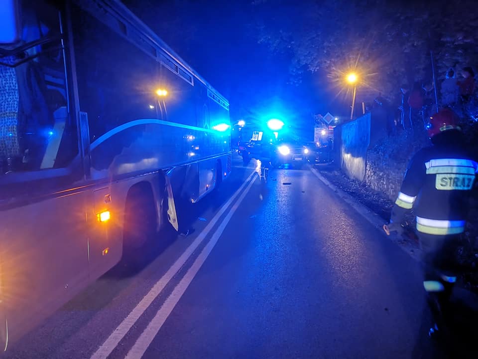 -Po przybyciu na miejsce zdarzenia ustalono, że doszło do zderzenia czołowo bocznego samochodu osobowego marki Skoda Fabia z autobusem kursowym marki Mercedes Integro –relacjonują strażacy – Droga została całkowicie zablokowana. Samochód osobowy w wyniku zdarzenia został wybity z toru jazdy następnie wjechał na chodnik i dodatkowo uderzył przodem w kamienisty mur. Samochodem podróżowały 2 osoby, które znajdowały się pod opieką załogi karetki Pogotowia Ratunkowego. Z samochodu marki Skoda nastąpił wyciek płynów eksploatacyjnych. W wyniku przeprowadzonego wywiadu z kierowcą autobusu, któremu nic się nie stało ustalono, że pojazdem podróżowało 7 osób, które oddaliły się w nieznanym kierunku przed przybyciem służb ratowniczych. Działania strażaków polegały na zabezpieczeniu miejsca zdarzenia, odłączeniu klem akumulatora w pojeździe marki Skoda oraz sorpcji wyciekających płynów eksploatacyjnych z samochodu osobowego. Jedna osoba została przetransportowana do sądeckiego szpitala. Działania strażaków trwały trzy godziny.
