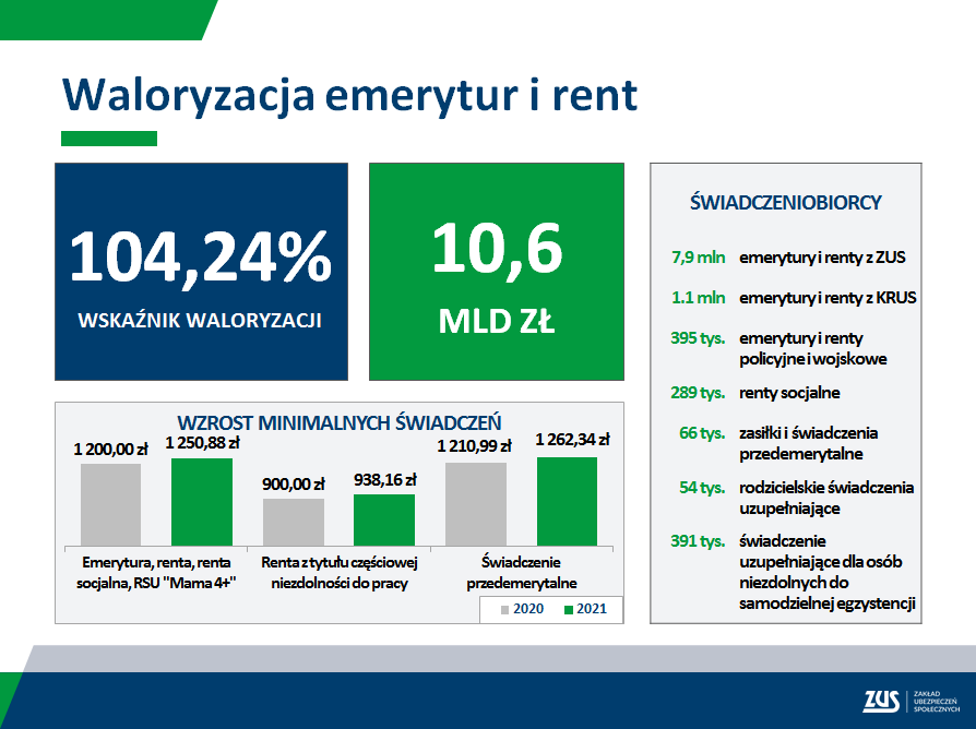 W ZUS waloryzacji podlegają świadczenia długoterminowe: emerytury, renty z tytułu niezdolności do pracy, renty rodzinne, nauczycielskie świadczenia kompensacyjne, a także dodatki do tych świadczeń, np. dodatek pielęgnacyjny czy dodatek dla sierot zupełnych, świadczenia i zasiłki przedemerytalne oraz renty socjalne. Waloryzacja obejmuje świadczenia przyznane do końca lutego 2021 roku.