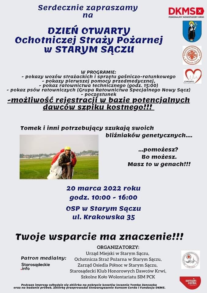Już dzisiaj (20 marca) w godzinach 10:00-16:00 odbędzie Dzień Otwarty Ochotniczej Straży Pożarnej w Starym Sączu. W programie wiele atrakcji, jednak tej imprezie przyświeca jeden cel. Rejestracja potencjalnych dawców szpiku dla chorego na białaczkę Tomasza Janczaka z Barcic. Akcja prowadzona będzie także w Barcicach (świetlica wiejska w Barcicach Dolnych, dawna zerówka, ul. Wiejska 57, Barcice Dolne).