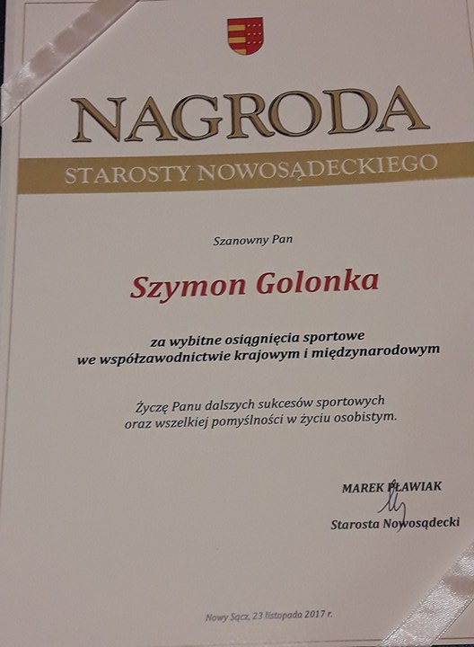 Podczas dorocznego spotkania władz Powiatu Nowosądeckiego ze sportowcami, trenerami i osobami promującymi zdrowy styl życia, starosta nowosądecki Marek Pławiak wręczył nagrody finansowe za wybitne osiągnięcia w dziedzinie kultury fizycznej i sportu. Sukcesów gratulowali im także wicestarosta Antoni Koszyk i radny Stanisław Sułkowski – przewodniczący Komisji Turystyki i Sportu Rady Powiatu Nowosądeckiego. Wśród nagrodzonych znalazł się starosądeczanin Szymon Golonka.