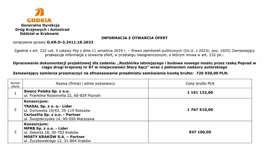 Trzy firmy chcą wybudować nowy most w Starym Sączu