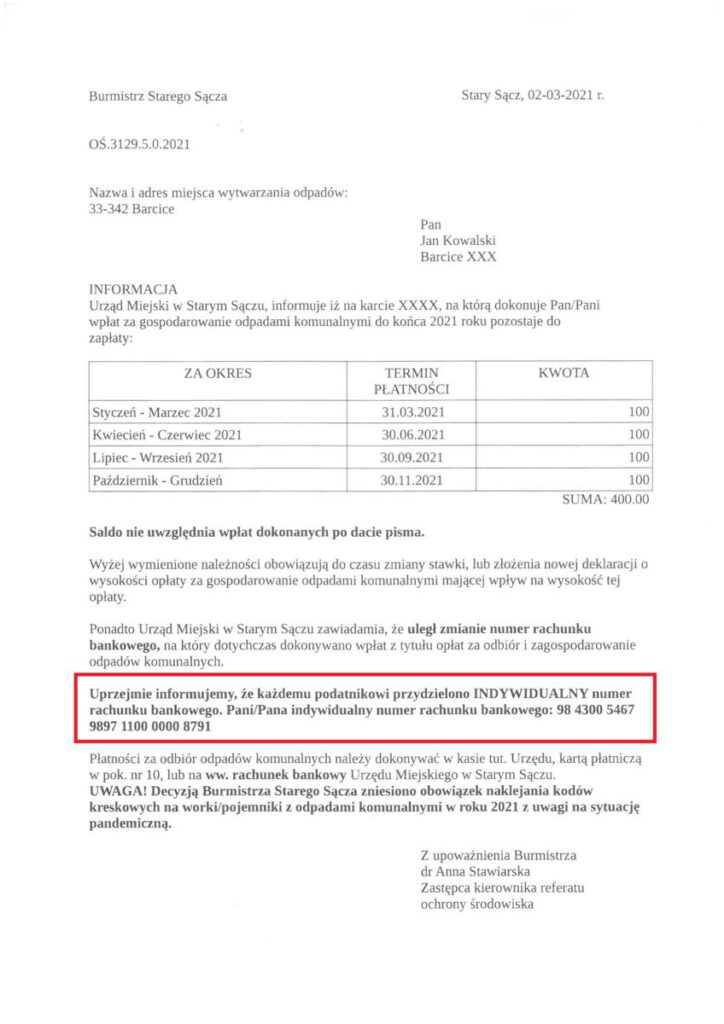 Uprzejmie informujemy, że zmienił się numer rachunku bankowego, na który dotychczas wpłacaliście Państwo opłaty za odbiór i zagospodarowanie odpadów. Teraz opłatę wpłacamy na indywidualny numer rachunku bankowego.