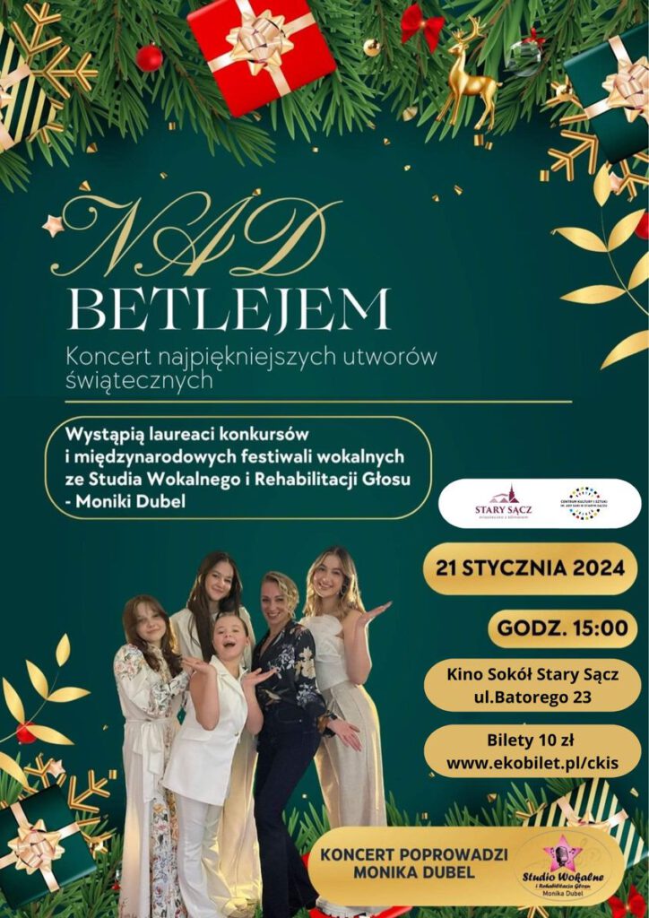 O godzinie 15:00 w Kinie Sokół w Starym Sączu odbędzie się piękny koncert najpiękniejszych utworów świątecznych „Nad Betlejem”. Wstęp -10 zł. Bilety można nabyć w kasie przed koncertem.