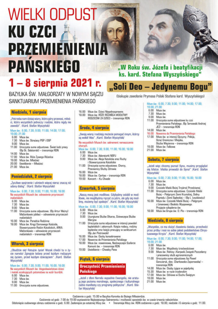 W piątek, 6 sierpnia główna uroczystość Przemienienia Pańskiego, uroczysta suma pod przewodnictwem Pasterza naszej diecezji ks. bpa Andrzeja Jeża o godz. 11:00. Wtedy też parafia będzie przeżywać 50 – lecie pobytu kard. Karola Wojtyły w sądeckim sanktuarium.