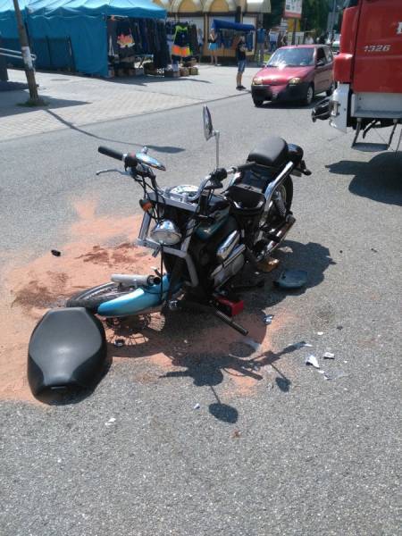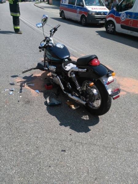 -Doszło do zderzenia motocykla marki Aprilla z samochodem osobowym marki Toyota -relacjonują strażacy – Motocyklem podróżował mężczyzna z dzieckiem w wieku 11 lat, którzy zostali poszkodowani. Kierowca samochodu osobowego Toyota nie uskarżał się na żadne dolegliwości. Przybyłe na miejsce dwie karetki pogotowia ratunkowego zabrały dwie osoby poszkodowane do szpitala. Strażacy z OSP kierowali ruchem drogowym, który odbywał się wahadłowo. Działania strażaków trwały dwie godziny. Policja prowadzi czynności wyjaśniające.