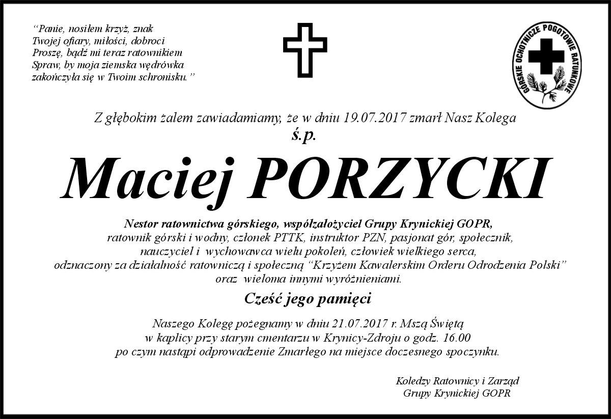 19.07.2017 zmarł Maciej PORZYCKI, człowiek gór, nestor ratownictwa górskiego, współzałożyciel Grupy Krynickiej GOPR.Wieloletni członek i sekretarz Rady Grupy Krynickiej GOPR. Msza św. pogrzebowa odbędzie się 21.07.2017 r. w kaplicy przy starym cmentarzu w Krynicy-Zdroju o godz. 16.00.