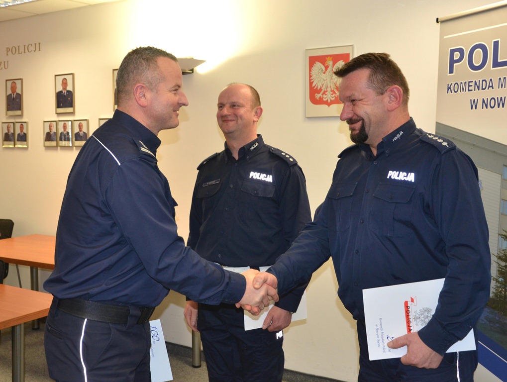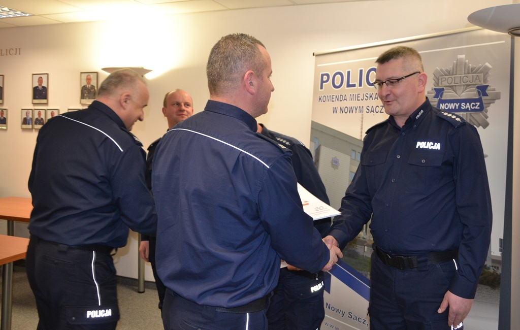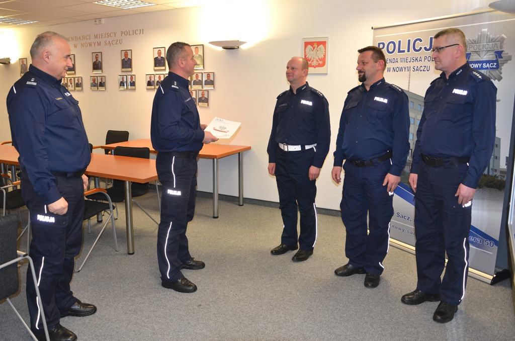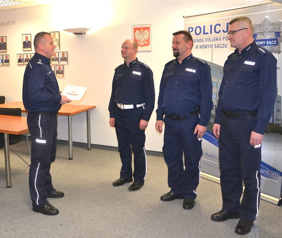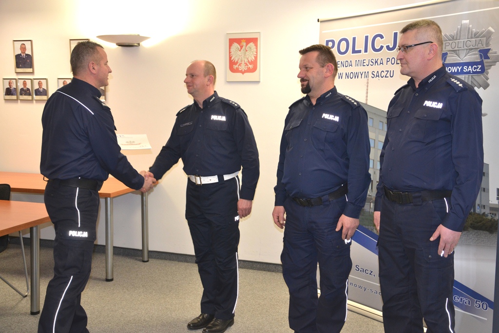 9 marca, Komendant Miejski Policji w Nowym Sączu – insp. Jarosław Tokarczyk, w obecności swojego I Zastępcy mł. insp. Adama Bukańskiego, wręczył trzem policjantom rozkazy personalne powierzenia obowiązków na nowych stanowiskach służbowych.